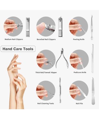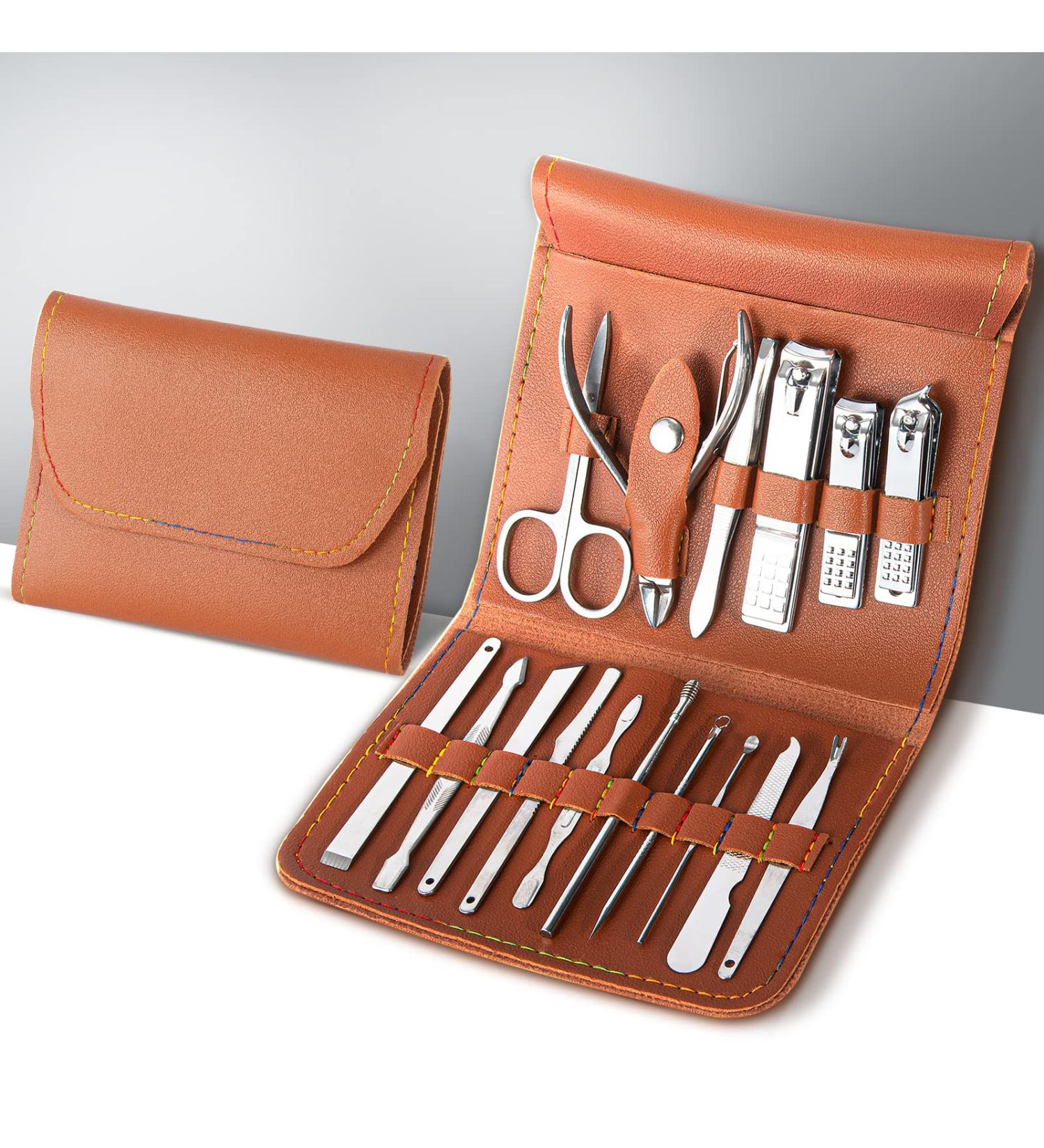 Best Personal Care GiftThe brown design is a excellent gift for all ladies in Christmas, birthday, anniversary or other festivals. Important tips: For health, It is better to use your own nail toenail care kit separately. Please store and keep manicure pedicure set away from children for safety. Multi-FunctionsManicure pedicure care tools kit contains 16 tools, nail clippers, toenail nipper, nail file, ear pick, eyebrow scissor, tweezers, ingrown toe tool and so on. The manicure pedicure care tools kit can manicure, pedicure, eyebrow correction, anti-acne, peeling, etc. Manicure pedicure set professional kit are perfect for removing dead skin around the nails and thick nails, Eyebrow scissors and eyebrow tweezers can trim your eyebrows to make your eyebrows more neat and natural. Sharp and Durable MaterialThe professional durable nail toenail clippers sets are made of high quality heavy duty stainless steel: Anti-rust corrosion resistant and colorfast. Nail clippers pedicure kit are manufactured by careful processes of cutting, polishing, laser engraving, plating, etc. All the nail care tools are sharp and sturdy, so easy to cut the thick nail toenails and even wires can be easily cut off! Nail clippers pedicure kit will give you a good trimming experience. Lightweight PortableAll manicure care tools toenail nipper kit are in a portable brown leather folding bag. The portable folding bag is made of stylish, lightweight and classic PU leather like a mini tote bag with compact size, making it a great accessory to carry around. You can put it at anywhere you want, such as handbag, car, luggage, office and so on, manicure pedicure set grooming kit is very suitable to use at home or travel. Manicure Pedicure Care Tools16 Pieces of stainless steel nail clipper kit contains nail and toenail nipper tools (scissors, nail clippers, cuticle remover, cutter, etc) to meet what you everyday grooming and hygiene needs, include hand care, facial care, foot care.