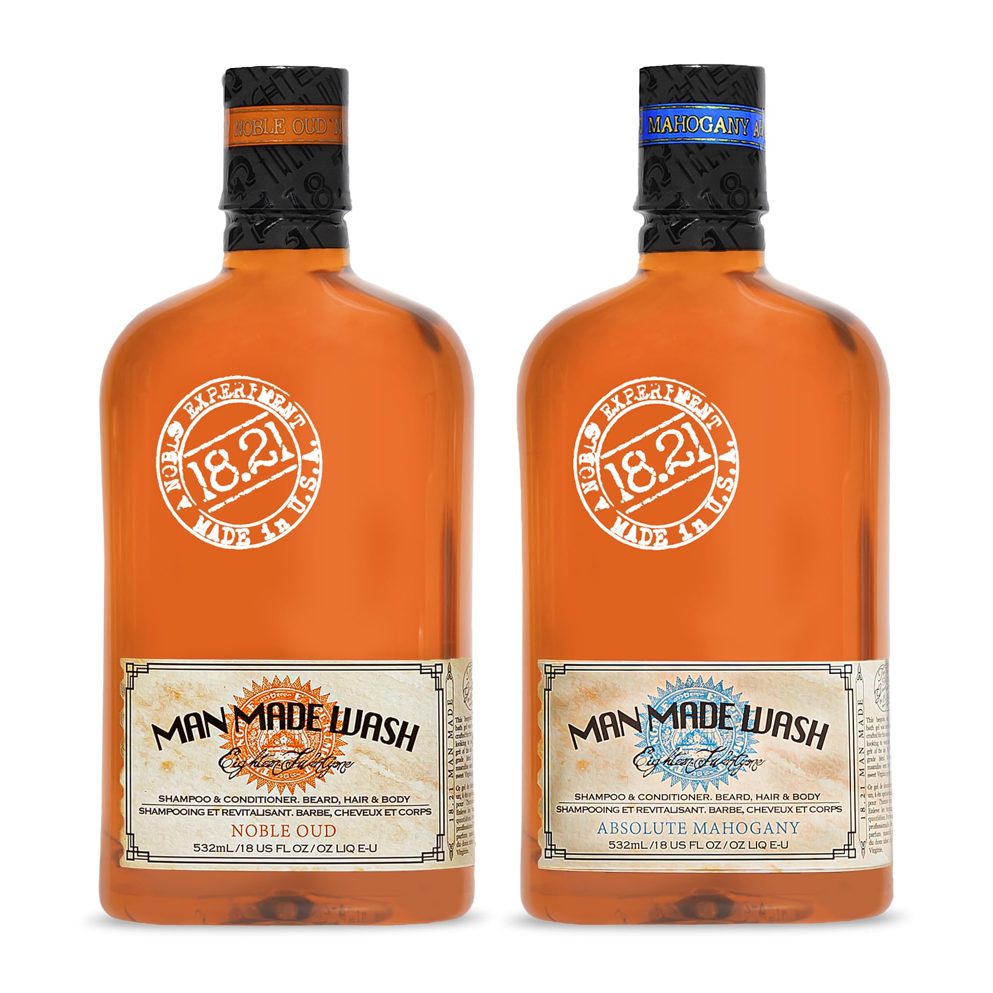 18.21 Man Made Noble Oud Wash & Absolute Mahogany 3-in-1 18 oz Wash 2-Set Bundle All Hair & Skin Types for Men Strengthens and Moisturizes in a Manly Aroma