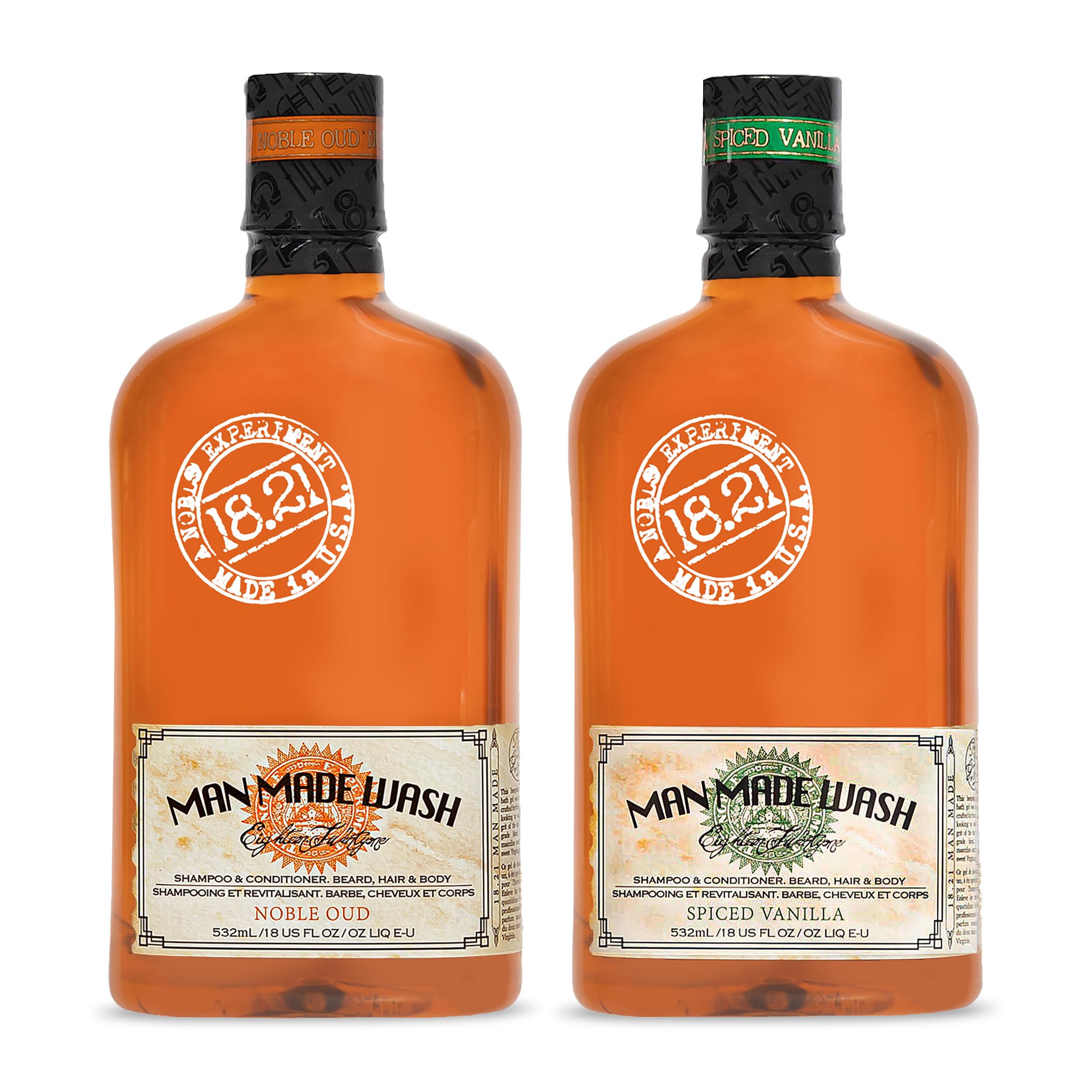 18.21 Man Made Noble Oud Wash & Spiced Vanilla 3-in-1 18 oz Wash 2-Set Bundle All Hair & Skin Types for Men Strengthens and Moisturizes in a Manly Aroma