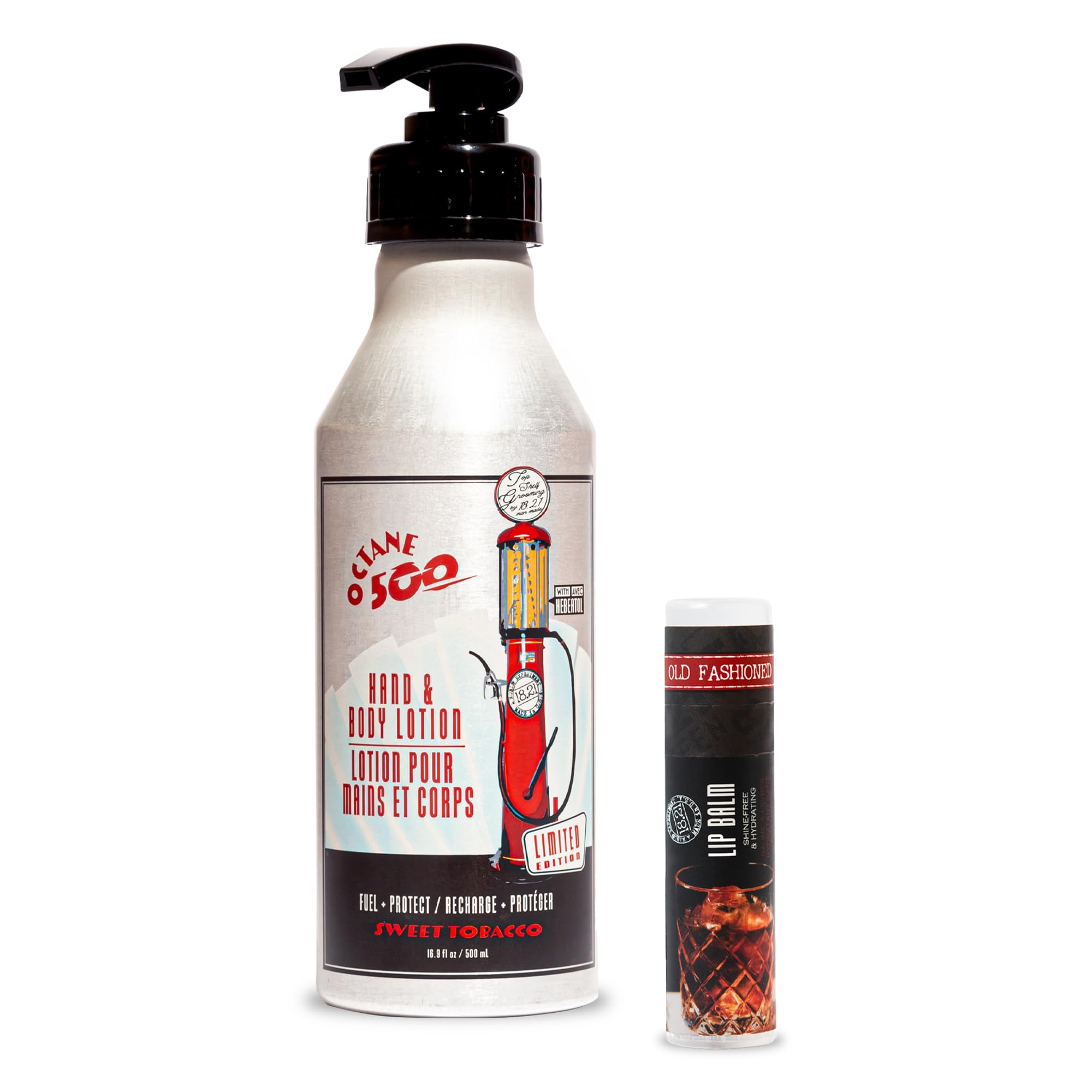 18.21 Man Made Octane 500 Sweet Tobacco Hand & Body Lotion & Lip Balm 2-Set Bundle All Hair & Skin Types for Men Strengthens and Moisturizes in a Manly Aroma