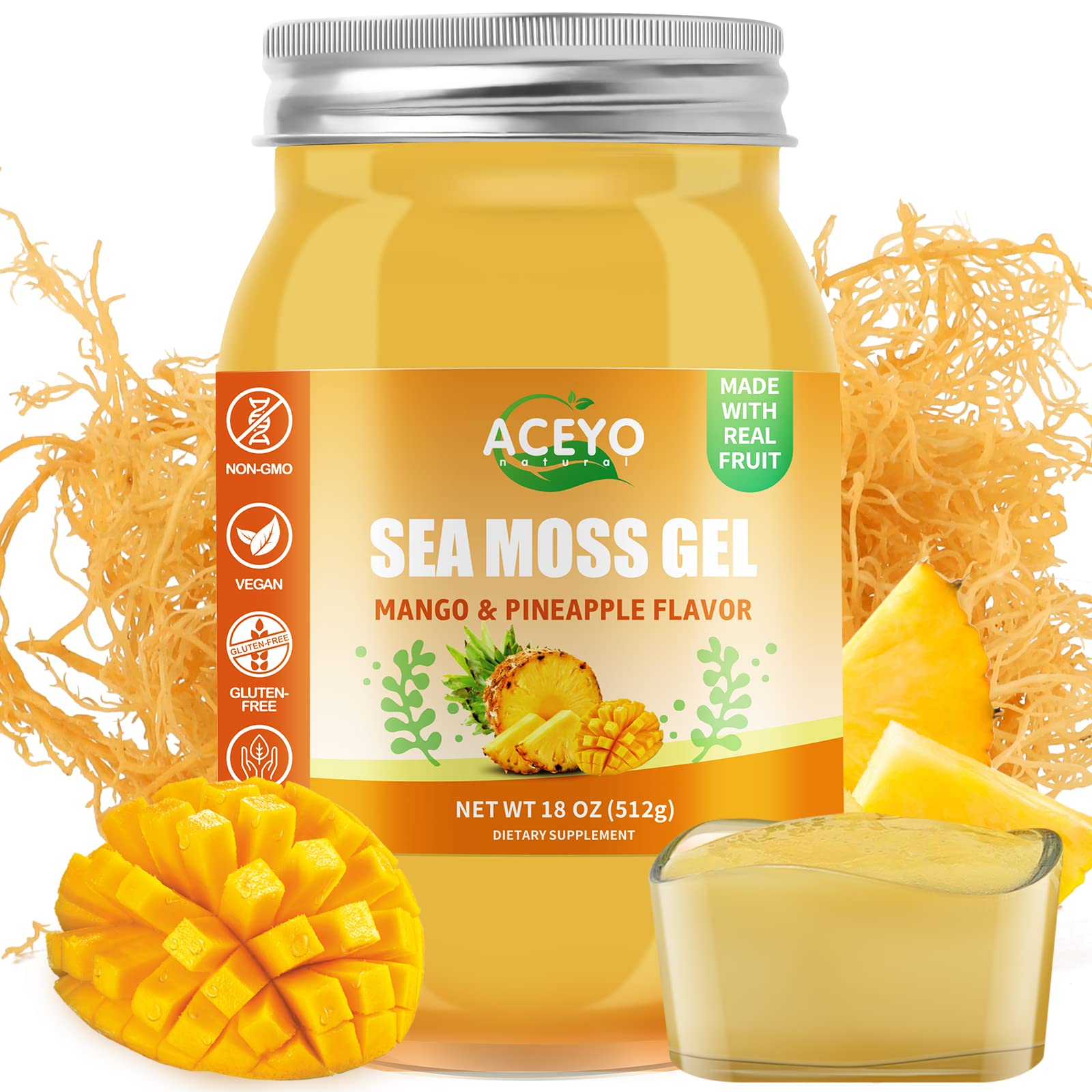 Made It With Safety Tested ACEYO Mango Pineapple Sea Moss Gel Are Made With Locally And Globally Sourced Ingredients And Are Produced In An Allergen-Free, GMP Certified Facility To Ensure Our Products Have a Great Reputation And Meet High Quality Standard. Multiple Ways To Enjoy It Our Wildcrafted Sea Moss Raw Gel, Has Mango And Pineapple Flavor, Is Great For Smoothies, Shakes, Teas, Juices, Soups And Desserts,Use It As An Ingredient In Your Favorite Salad Or Make Some Sandwiches. Natural Ingredients Mango Pineapple Flavor This Vegan Irish Sea Moss Gel 100 Organic, All Ingredients Are Chosen And Made Under The Highest Safety Standard, Made With Gluten-Free, No Gmos And No Artificial Color, Flavor Or Sweetener No Preservatives. Also With Yummy Fresh Fruit Mango Pineapple Flavor, Great For Your Family Adults And Kids. Multiple Benefits, Great For Your Health Our Sea Moss Gel Organic Raw Help Our Bodies Absorb Faster, Brings Many Benefits, Sea Moss Gel Contain Iodine, Magnesium, Iron, And Calcium. Essential Nutrients Organic Sea Moss Gel Our Natural Sea Moss Gel, With Fresh Fruit And Multi- Vitamins , Vitamins A, B,C, E, G And K Selenium, Manganese, Provide 102 Essential Vitamins And Minerals For Your Body, Improve Your Healthy Lifestyle.