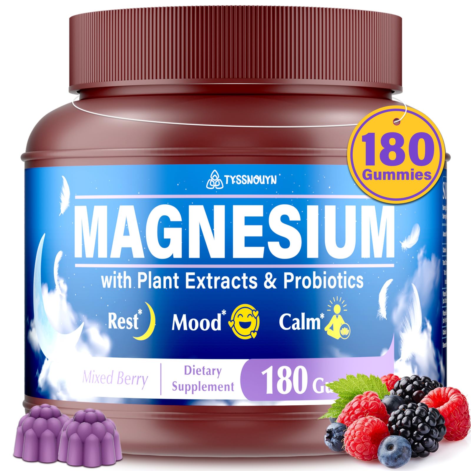 Safe Additive-Free Brand Trust: These magnesium complex gummies are sugar-free, free from artificial colors, preservatives, gluten, and dairy products. They pass the highest quality standards in the factory, are gentler than others, and do not cause dependency with long-term use. Multi-Functional for Exercise Recovery, Mood Rest: Take before bed to benefit your rest, after workouts it will be kind to your muscles, and take during work or study to focus better. Suitable for night owls, fitness enthusiasts, students, and high-strength workers—one bottle meets multiple needs. Family-Friendly Design 180-Count Large Package: Our magnesium complex gummies come in a 180-count bottle (most on the market only have 60-120 count), offering better value for money suitable for dual dosing (3 gummies for adults 1 gummy for children), sugar-free mixed berry flavor, the whole family can enjoy healthy rest, children love it, adults can rest assured. Gut-Brain Axis Dual Pathway Rest: Exclusively formulated with 1000mg of plant-based calming complex (Ashwagandha L-theanine chamomile), which helps reduce cortisol levels and promote GABA production paired with 10B CFU probiotics (5 strains), enhancing magnesium absorption and regulating the gut-brain axis, good for rest and mood from the root cause, more effective than ordinary magnesium gummies. Four Magnesium Synergistic Formula 500 mg Highest Dosage on the Market: Each 3 gummies contain 500mg of magnesium (Over 95 of products on the market only contain 200-400mg), scientifically formulated with magnesium glycinate, magnesium taurate, magnesium citrate, and magnesium malate, providing comprehensive benefits for your rest, mood, and muscle health.