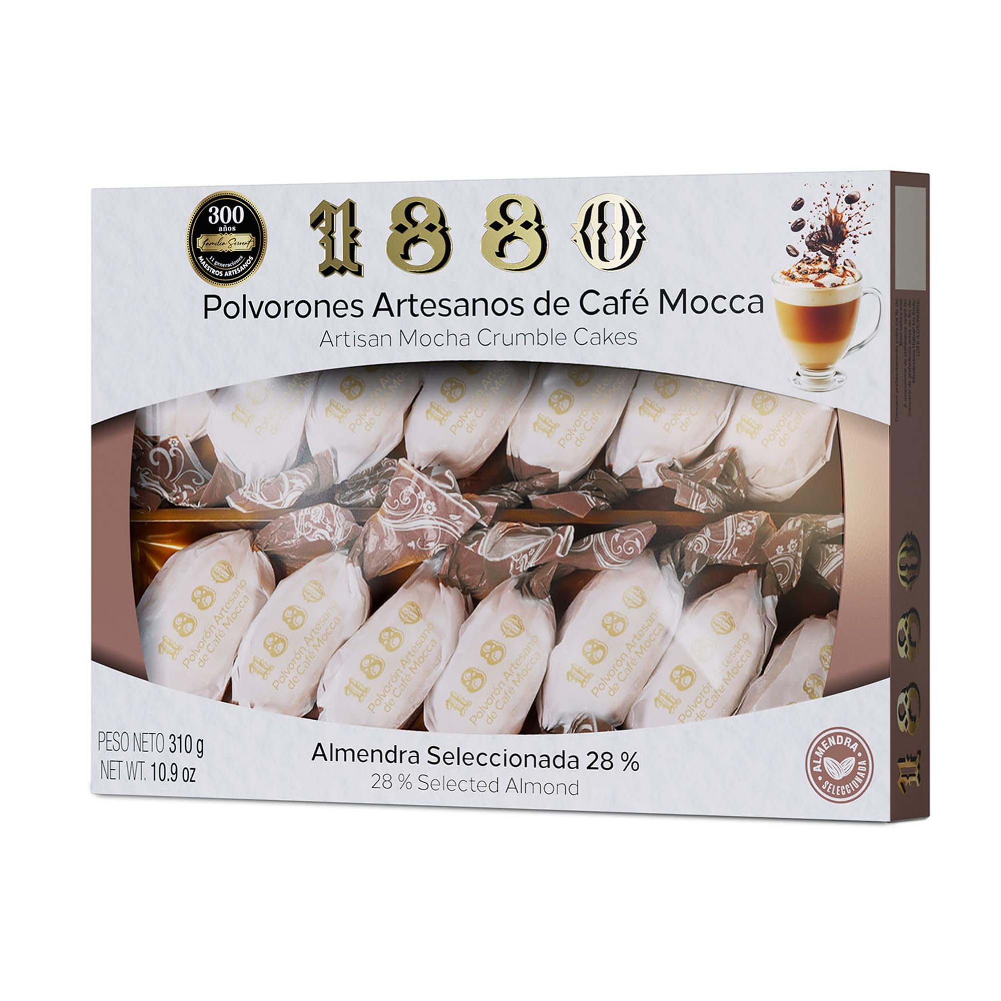1880 – Polvorones Artisanaux au Café Mocca 310 g, Biscuit Sablé Espagnol à la Texture Fondante, Arôme de Café et Amande Grillée, Emballage Individuel, Qualité Suprême