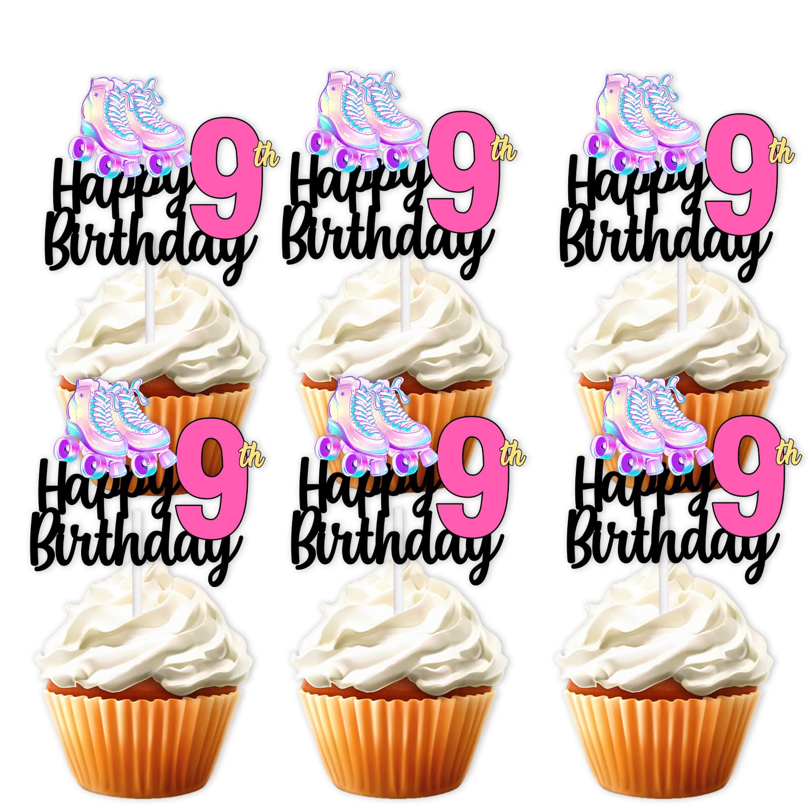 18pcs Pink Glitter Roller Skates Happy Birthday Dessert Cupcake Topper 80s 90s Retro Hip Hop Roller Skating Theme Decor Supplies Boys Girls 9th Happy Birthday Party Decorations 09
