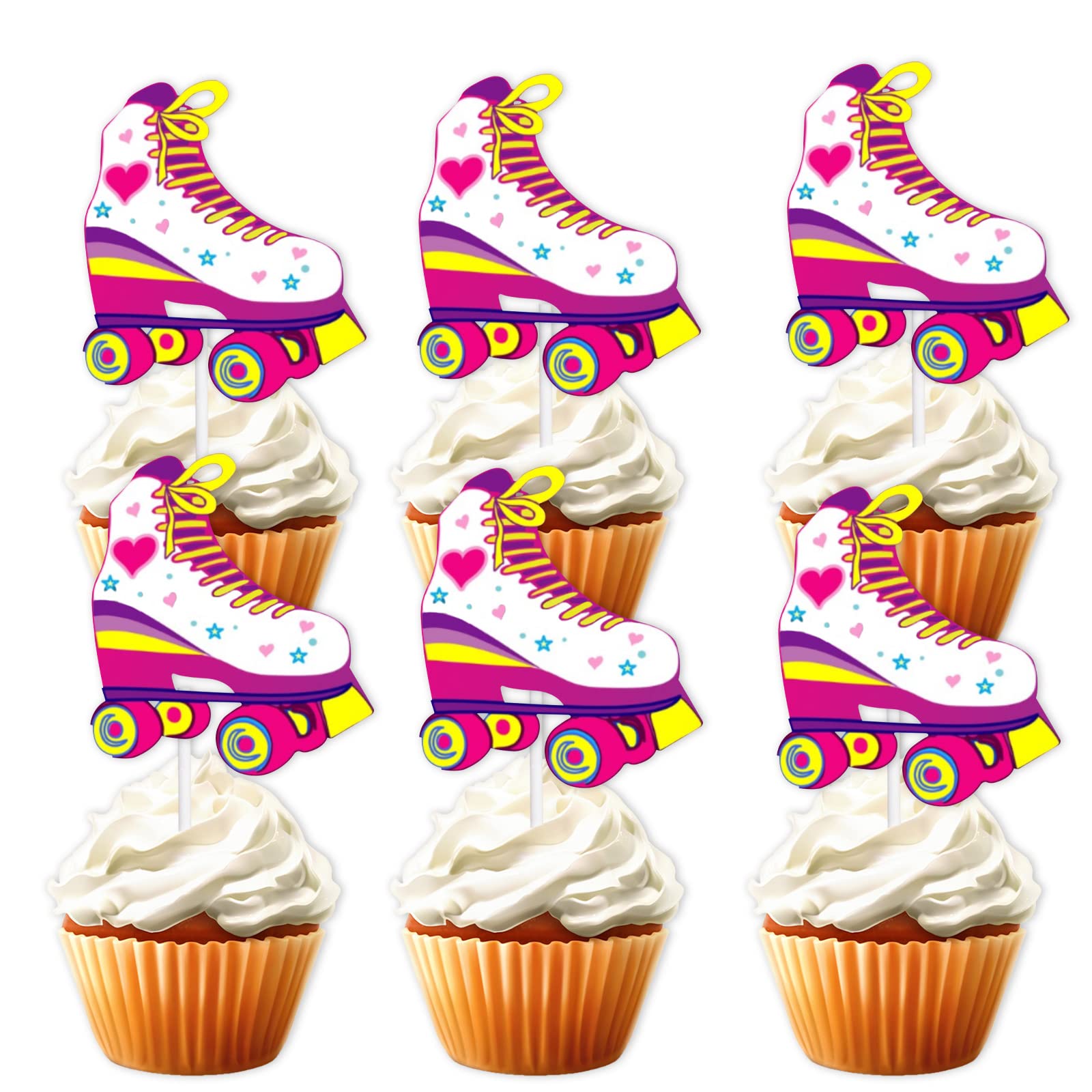 18pcs Pink Heart Roller Skates Glitter Dessert Cupcake Topper 80s 90s Retro Hip Hop Roller Skating Theme Decorations Boys Girls Happy Birthday Party Decor Supplies
