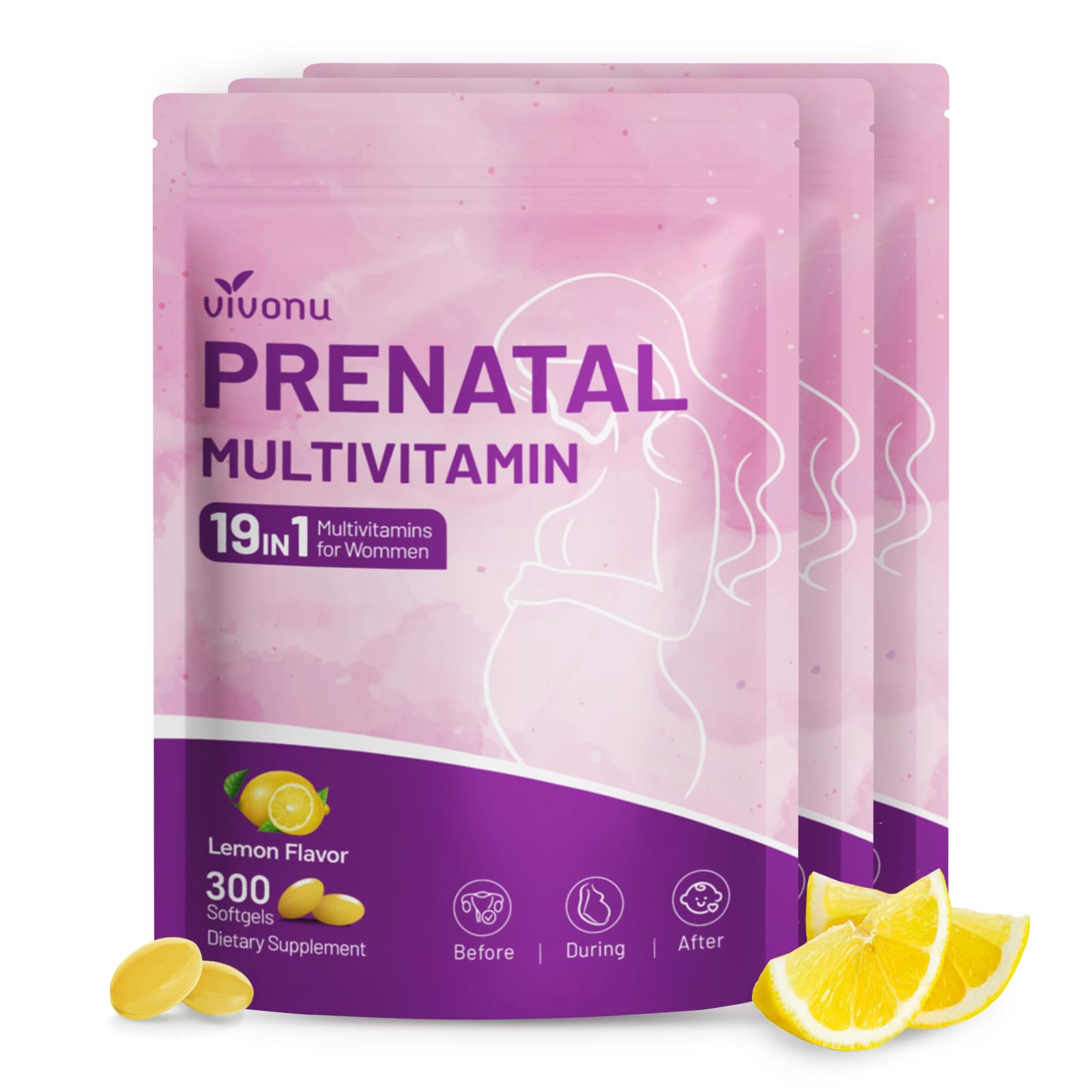 Warm Weather Friendly Reminder: It's normal for softgels to stick together and clump during warm weather conditions. This does NOT affect the quality or efficacy of the product. To release the clumps, give your packaging bags a good shake or knock it against the counter or Simply place the sealed packaging bags in the freezer for 30 minutes to restore them. Easy-to-Take Lemon Softgels: Delicious lemon flavor and softgel format make daily prenatal support simple, gentle, and convenient. 300 easy-to-swallow softgels, 3 capsules per day, provide 100 days of supply. Probiotic-Enhanced Formula: Includes a 1 Billion probiotic blend to support digestion and nutrient absorption. Essential Nutrients for Mom Baby: Contains key vitamins and minerals including Folic Acid, Vitamin D3, B6, B12, C, K2, Calcium, Iron, Zinc, Magnesium, and Choline for daily nourishment. Complete Prenatal Support: 19-in-1 multivitamin formula designed for women before, during, and after pregnancy, supporting both maternal health and fetal development.