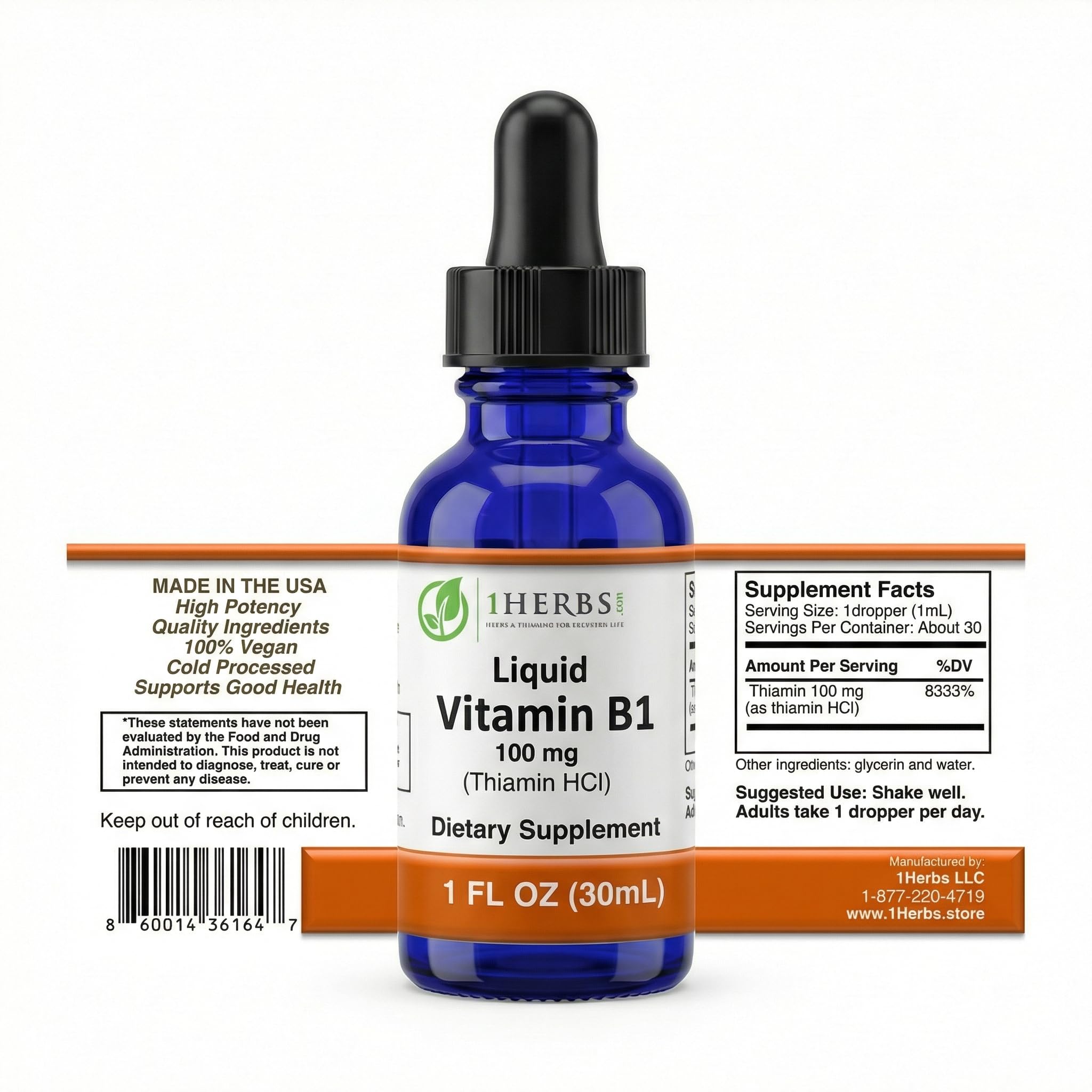 High-Potency Liquid Vitamin B1 (Thiamine HCl) — 100mg Per Serving, Alcohol-Free 1Herbs Liquid Vitamin B1 provides a clean, fast-absorbing source of Thiamine Hydrochloride (Vitamin B1) in a convenient liquid form. Thiamine is an essential B vitamin that supports energy production, carbohydrate metabolism, nerve function, brain health, and cardiovascular support. Unlike capsules or tablets, this liquid Vitamin B1 supplement is designed for quick absorption and easy daily use, making it an excellent choice for individuals who prefer liquid vitamins or want efficient nutrient delivery. Each serving delivers 100mg of high-quality Thiamine HCl, suspended in an alcohol-free base that is gentle on digestion and suitable for long-term daily supplementation. Benefits of 1Herbs Liquid Vitamin B1 Supports natural energy metabolism and vitality Helps maintain healthy nervous system and brain function Assists in carbohydrate metabolism and digestive support Fast-absorbing liquid thiamine drops Alcohol-free, vegan, non-GMO formula No artificial colors, flavors, or preservatives Made in the USA with strict quality standards Who May Benefit from Vitamin B1 (Thiamine)? Vitamin B1 is essential for adults of all ages and may be especially beneficial for individuals with high-carbohydrate diets, active lifestyles, increased nutritional demands, or those seeking nervous system and energy support. The 1Herbs Commitment At 1Herbs, we specialize in clean-label liquid vitamins and herbal supplements manufactured in our Colorado facility. We control every step of production—from sourcing to bottling—to deliver supplements you can trust. These statements have not been evaluated by the Food and Drug Administration. This product is not intended to diagnose, treat, cure, or prevent any disease.✓ MADE IN THE USA GMP CERTIFIED THIRD-PARTY TESTED Manufactured in our own FDA-registered, GMP-certified facility in Colorado. Every batch is third-party lab tested to ensure quality, purity, and potency. ✓ CLEAN LABEL, ALCOHOL-FREE, VEGAN NON-GMO Formulated without alcohol, artificial flavors, or unnecessary fillers. A clean, gentle liquid thiamine supplement suitable for daily use. ✓ SUPPORTS ENERGY PRODUCTION, NERVE BRAIN FUNCTION Vitamin B1 plays a key role in converting carbohydrates into energy and supporting nervous system, brain, and cardiovascular health. Perfect for daily wellness, focus, and metabolic support. ✓ FAST-ABSORBING LIQUID B1 — NO PILLS OR CAPSULES This liquid Vitamin B1 supplement absorbs faster than tablets or capsules, making it ideal for those who want efficient nutrient delivery or have difficulty swallowing pills. ✓ HIGH-POTENCY VITAMIN B1 (THIAMINE HCl) – 100MG PER SERVING Each serving delivers 100mg of Thiamine Hydrochloride (Vitamin B1), a well-researched and widely used form of thiamine that supports energy metabolism, nerve signaling, and overall vitality.