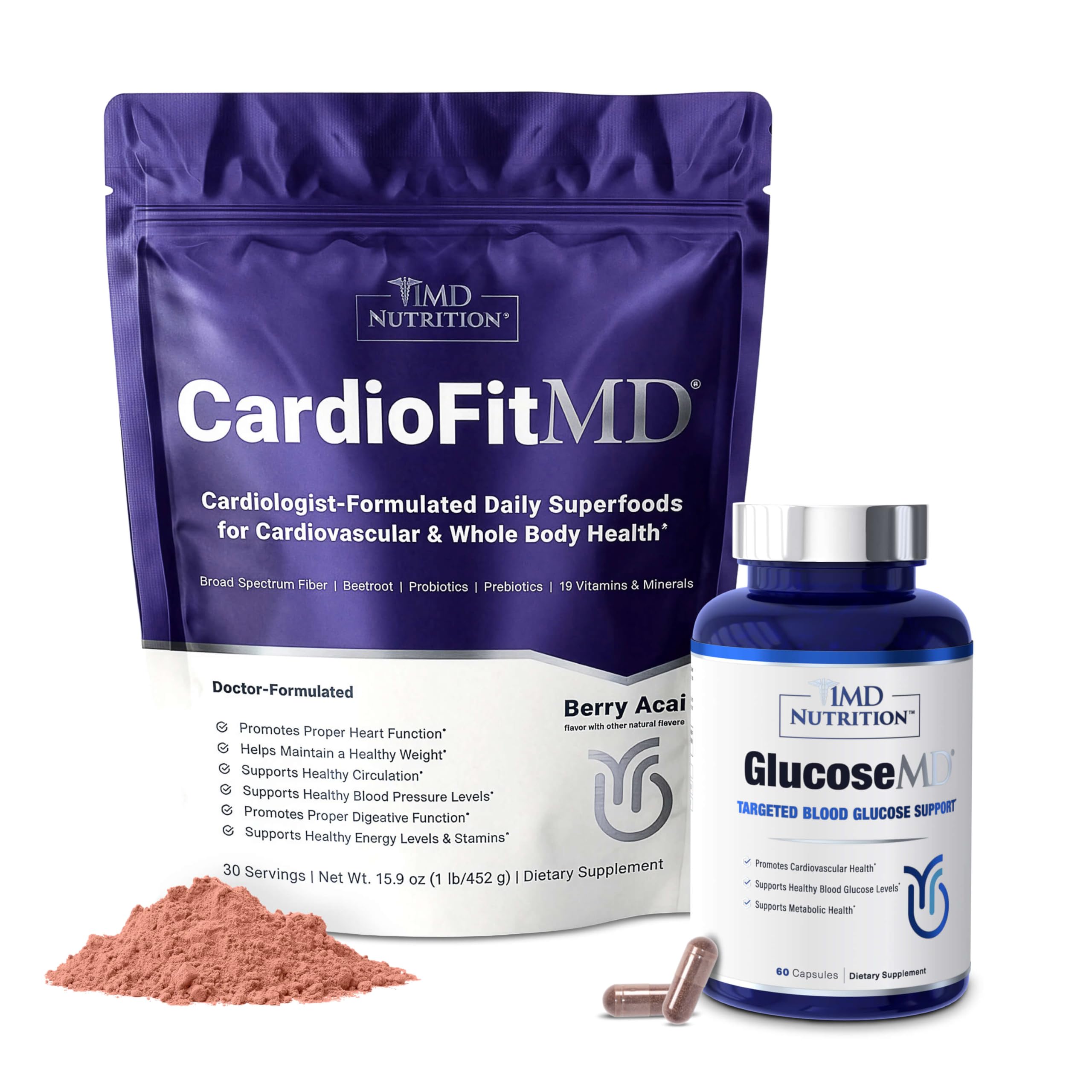 GlucoseMD: Contains 7 carefully-selected ingredients, including berberine bark extract, chromium, and gymnema. CardioFItMD: Proper Stamina Healthy Weight Management: One scoop a day can help support energy levels. With proper stamina, you can maximize your fitness routine and promote healthy weight management. . CardioFItMD: Promote Nitric Oxide Production: The production of nitric oxide, an essential neurotransmitter, slows as part of normal aging. Our potent beetroot powder provides optimum levels of nitric oxide. CardioFItMD: Broad-Spectrum Dietary Fiber: Our proprietary broad-spectrum fiber and prebiotic blend contain 29 of the recommended daily serving. With only 5 of Americans getting enough fiber, CardioFitMD helps close the 'fiber gap' so you can support proper digestive, heart, and whole-body health. . CardioFItMD: Comprehensive Convenient Nutrition: CardioFitMD is the ultimate, all-in-one superfood drink with a broad-spectrum fiber and prebiotics blend, Bacillus coagulans probiotic, and 20 key letter vitamins and minerals, to provide balanced nutrition every day. .