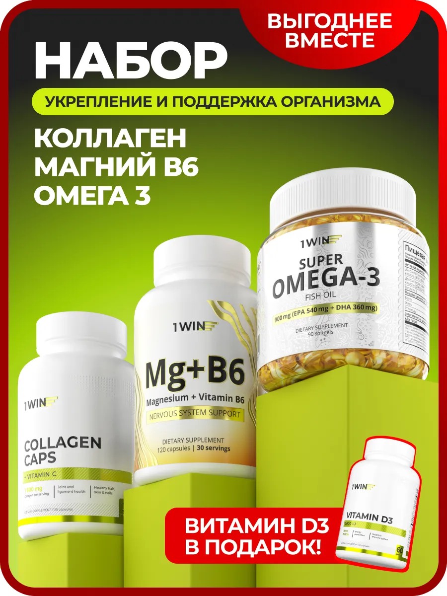 | Комплектация | 1WIN Набор витаминов 008 Omega-3 900мг 90к + Коллаген+Вит С 155к + Магний+В6 120к + под D3 2000 60К |