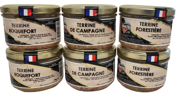 Ingredients for forest terrine: Meat, fat and pork liver from France Dry forest mix (1.5 ) Milk Salt Pepper Garlic Spices No coloring or preservatives Nutritional values per 100 g: Energy: 1623 kJ (393 kcal) Fat: 36.8 g of which saturated fatty acids: 14.3 g monounsaturated fatty acids: 16.8 g polyunsaturated fatty acids: 4 g Carbohydrates:Country terrines are very popular in France and are often eaten at picnics, family meals, or as aperitifs. They are an integral part of French culinary tradition and are appreciated for their rustic taste and authentic character. Country terrines are usually served thinly sliced, cold or at room temperature. They are delicious with fresh bread or crackers, and are often accompanied by pickles, mustard, or jam for added flavor. The pack contains 2 plain country terrines, 2 country forest terrines (with mushrooms), and 2 country terrines with Roquefort (a cheese from southwest France). Each 180g can is suitable for a starter for 4 people or to complement your charcuterie platters. Long-lasting, product subject to a best before date of 4 years from the date of manufacture. Keep refrigerated after opening and consume quickly. Let yourself be tempted by this succulent batch of terrines made from French pork - Made without coloring or preservatives, rediscover the good taste of pâté like in the past. Ingrédients terrine forestière : Viande, gras et foie de porc origine France Mélange forestier sec (1,5 ) Lait Sel Poivre Ail Épices Sans colorant ni conservateur Valeurs nutritionnelles pour 100 g : Energie : 1623 kJ (393 kcal) Matières grasse : 36,8 g dont acides gras saturés : 14,3 g acides gras monoinsaturés : 16,8 g acides gras poly-insaturés : 4 g Glucides :Les terrines de campagne sont très populaires en France et sont souvent consommées lors de pique-niques, de repas en famille ou d'apéritifs. Elles font partie intégrante de la tradition culinaire française et sont appréciées pour leur goût rustique et leur caractère authentique. Les terrines de campagne sont généralement servies en tranches fines, froides ou à température ambiante. Elles sont délicieuses avec du pain frais ou des craquelins, et elles s'accompagnent souvent de cornichons, de moutarde ou de confiture pour ajouter de la saveur. Le lot contient 2 terrines de campagne natures, 2 terrines de cmapgnes forestières (aux champignons) et 2 terrines de campagne au roquefort (fromage du Sud-Ouest de la France). Conserves de 180 g chacune, chaque conserve convient pour une entrée de 4 personnes ou pour compléter vos plateaux de charcuteries. Concervation longue durée, prduit soumis à une DDM de 4 ans à date de fabrication. Conservez au réfrigérateur après ouverture et consommer rapidement. Laissez vous tenter par ce ce succulent lot de terrines à base de porc français - Fabrication sans colorant et sans conservateur, retrouvez le bon goût du pâté comme autrefois.