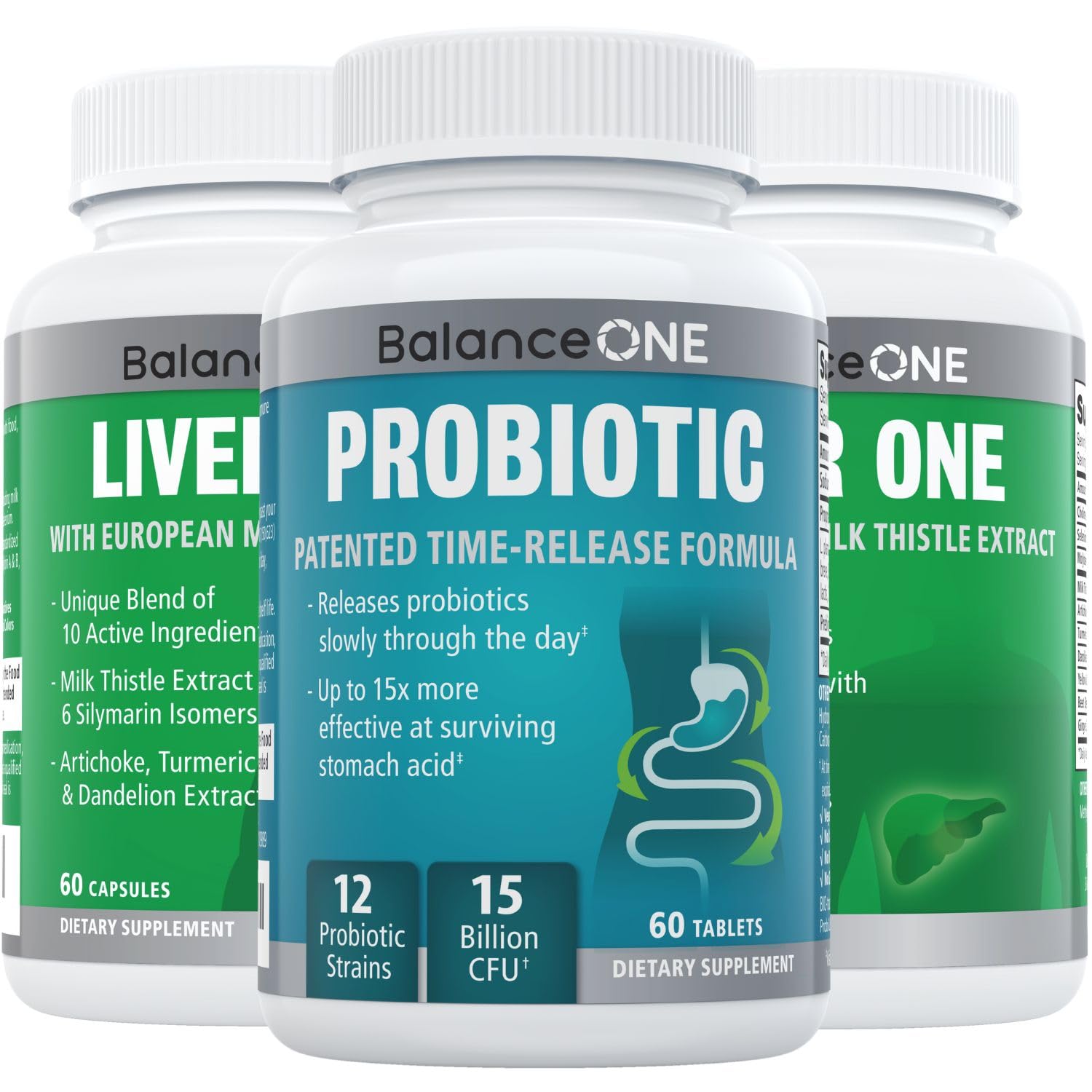 Support your gut and liver health with the 2 Month Balance One Liver Gut Health Bundle, featuring Balance One Probiotic and Liver One. This powerful combination promotes better digestion, liver detoxification, and overall wellness—perfect for those looking to optimize gut function while supporting natural liver detox. Balance One Probiotic delivers 15 billion CFUs from 12 powerful strains, using a time-release delivery system that protects probiotics from stomach acid, ensuring they reach the gut for maximum absorption and effectiveness. Meanwhile, Liver One is packed with milk thistle extract, artichoke leaf extract, dandelion root extract, selenium, molybdenum, and more, helping to detoxify, cleanse, and protect your liver from daily toxins. Both supplements are free from artificial additives, gluten, soy, dairy, and GMOs. The probiotic requires no refrigeration, making it easy to take at home or on the go. Take control of your digestive and liver health with this essential wellness bundle!MADE IN THE USA WITH CLEAN, HIGH-QUALITY INGREDIENTS. Balance One supplements are manufactured in a GMP-certified facility using carefully selected, pure ingredients to support your health and wellness. NO REFRIGERATION NEEDED, PURE CLEAN FORMULA. Our shelf-stable probiotic is perfect for home or travel, while Liver One contains no artificial additives, gluten, soy, or GMOs—just clean, effective ingredients. LIVER DETOX PROTECTION. Liver One features milk thistle extract, dandelion root, and key antioxidants like molybdenum and selenium to help detoxify the liver, support natural cleansing, and protect against oxidative stress. ADVANCED TIME-RELEASE PROBIOTIC. Balance One Probiotic delivers 15 billion CFUs with 12 powerful strains using patented time-release technology to ensure probiotics survive stomach acid and reach deep into the gut for maximum effectiveness. COMPLETE GUT LIVER SUPPORT. This powerful bundle combines 1 bottle (2 month supply) of Balance One Probiotic for digestion and immunity with 2 bottles of Liver One, a potent liver detox and support formula. Together, they promote optimal gut balance, liver function, and overall wellness.