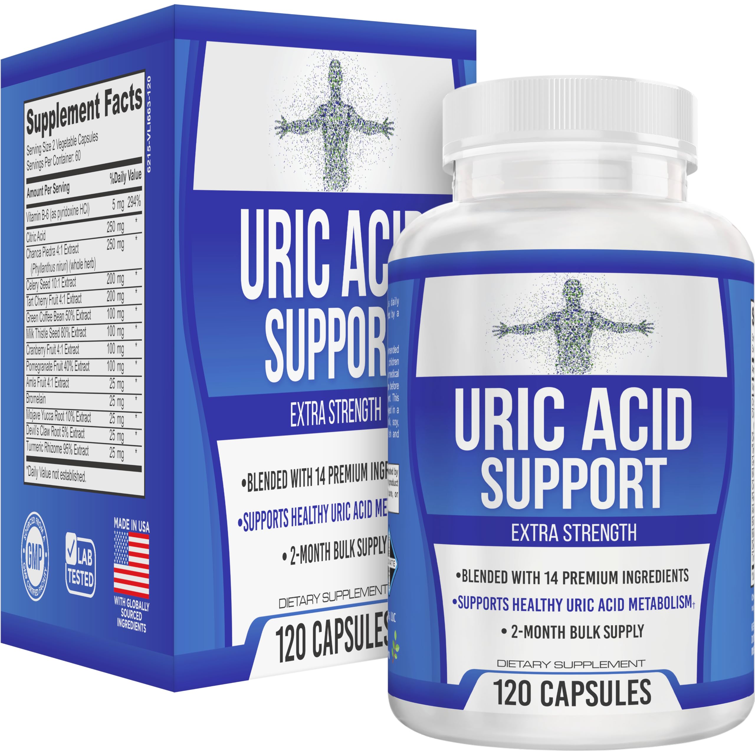 Our supplement products arrive fast, fresh safety-sealed, with an average of 12-18 months remaining before the expiration date printed on the bottom of each bottle. 60-Day Supply Bottle 120 Capsules. Uric Acid Herbal Blend with 14 Active Ingredients. Strategically formulated with: Vitamin B-6, Citric Acid, Chanca Piedra Extract, Celery Seed Extract, Tart Cherry Fruit Extract, Green Coffee Bean Extract, Milk Thistle Seed Extract, Cranberry Fruit Extract, Pomegranate Fruit Extract, Amla Fruit Extract, Bromelain, Mojave Yucca Root Extract, Devil's Claw Root Extract, and Turmeric Rhizome Extract Uric Acid Support Complex. All-in-1 Uric Acid Health Support Supplements.