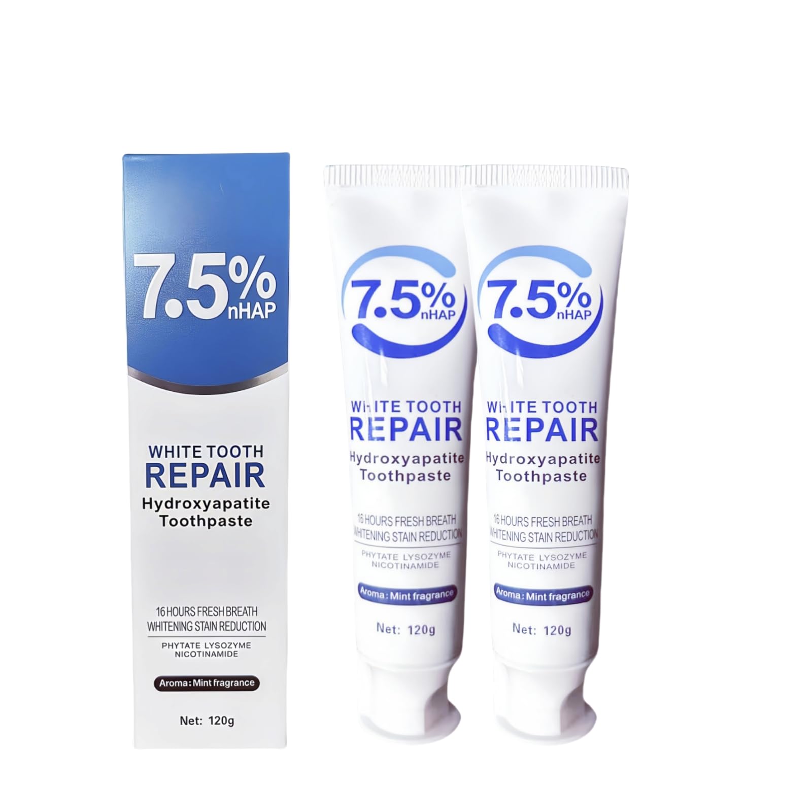 [Natural Brightening Fresh Breath] Achieve a naturally brighter smile and lasting fresh breath. Our gentle mint formula effectively removes surface stains without harsh abrasives, leaving your mouth feeling clean and your breath minty fresh. [Safe Clean Ingredients] Your well-being is our priority. Our toothpaste is 100 Fluoride-free, SLS-free, and Paraben-free. Infused with Phytate and Nicotinamide, it supports healthy gums and maintains overall oral hygiene naturally. [Gentle Relief for Sensitive Teeth] Specifically designed for those with sensitivity to cold, heat, or sweets. Our fluoride-free formula cleans thoroughly without irritation, helping to comfort sensitive areas and provide a soothing, refreshing brushing experience. [Advanced 7.5 nHAP Enamel Protection] Formulated with 7.5 Nano-Hydroxyapatite (nHAP), a key mineral that supports the natural integrity of your teeth. This advanced formula helps provide a protective shield for your enamel and maintains a stronger-feeling tooth surface. BEST VALUE 2-PACK Stock up and save! You get two premium 120g tubes of 7.5 Nano Hydroxyapatite toothpaste. Get professional dental care at an unbeatable price—perfect for long-term enamel repair and sensitivity relief.