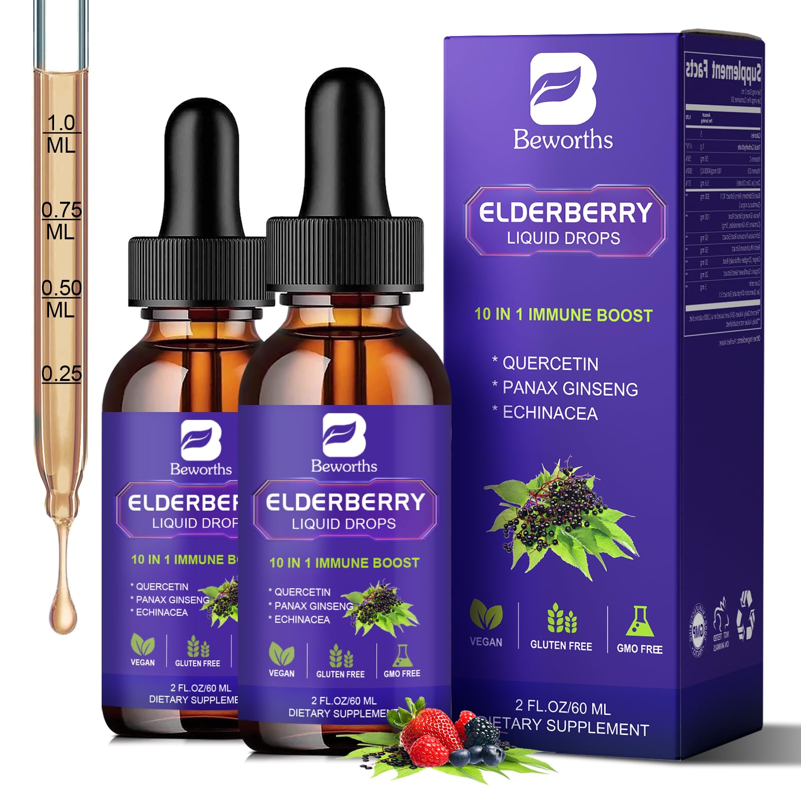 Well-being Life Commitment We ensure you always get the better products that help our customers live happier and healthier lives Provide a convenient and tasty way to incorporate elderberry into your routine Align your wellness journey with B BEWORTHS, a brand committed to your well-being. Vegan Non-GMO These black elderberry syrup are vegan and non-GMO, sugar free and do not contain gluten, dairy, eggs, milk, tree nuts, peanuts, shellfish or artificial colors. Tasty Easy to Take Our delicious berry-flavored elderberry syrup promotes wellness for the entire family Its convenient liquid form makes it easy to consume, simply add it to any beverage to enjoy its benefits No more struggling with hard-to-swallow pills or capsules! Take 1-2 ml daily for 60-120 days supply. Premium Black Elderberry Our sambucus elderberry supplement provides of super-concentrated elderberry extract per serving, which is equivalent of fresh fruit elderberry drops delivers the maximum amount of polyphenols and phytonutrients that are available, concentrated into just 1-2 ml of drops. Super Immune Support elderberry Elderberries offer potent immune system support, boasting a higher content of flavonoids than blueberries, cranberries, goji berries, and blackberries black elderberry elderberrysuperiority stems from the presence of chemical compounds known as anthocyanidins, which are renowned for their immune support effects on the body Incorporating 10-1 elderberry extract drops into your routine provides comprehensive support. Elderberry Liquid with Vitamin C Zinc Our elderberry syrup is enriched with potent antioxidants such as Vitamin C, zinc, and quercetin, offering comprehensive antioxidant support and aiding in skin health, energy levels, digestive function, joint health, and beyond! Elderberry vitamin c and zinc premium elderberry liquid also boasts a blend of panax ginseng root extract, echinacea purpurea root, sunflower seed, ginger root, reishi mushroom, and Vitamin D3, all of which have been proven to enhance your overall wellbeing in diverse ways.