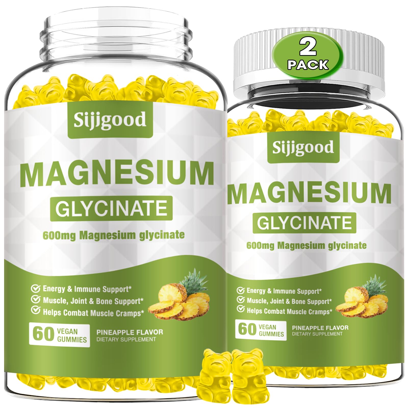2 Pack Magnesium Glycinate Gummies 600mg Relaxation & Zzz Support Magnesium Potassium Supplement for Adults and Kids Sugar-Free Vitamin C B6 B12 D3 and CoQ10 Pineapple Flavor 120 Count Pineapple 60 Count (Pack of 2)