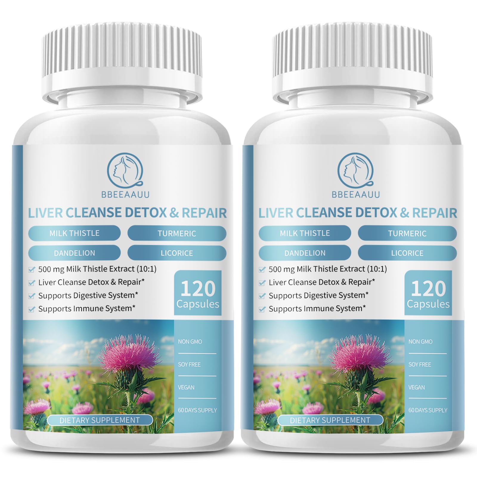 (2 Pack) BBEEAAUU Milk Thistle Supplement Capsules, Liver Health Formula, with Dandelion Root, 10:1 Extract, for Liver Detox Cleanse Support, Digestive Immune System,240 CountAfter-Sales Service: If you have any questions about BEAU's liver complex supplement, you can email us and we will reply within 24 hours. Ideal Liver Detox Supplements Selection: BEAU Liver capsules made from high-quality materials, soy free, non-GMO, vegetarian friendly no artificial additives. In a milder and more moderate way, 10:1 extract, improve bioavailability and absorption. Liver supplements suitable for adults women and men, also suitable for the middle-aged and elderly. It would be a good choice of gift for special days, such as birthday, family day, etc. 100 Natural Ingredients: Undergoes rigorous testings, liver cleanse detox capsules (per serving, 2 Capsules) contains 500mg silymarin milk thistle extract, 100mg dandelion root extract, 120mg cassia seed extract, 75mg turmeric extract, 100mg licorice extract, Vitamin C, Vitamin A, Vitamin B6, Zinc. Digestive Immune System Support : While keeping liver function, liver health supplement also strengthens the digestive system and enhances the immune system . Coupled with some daily exercise, liver support supplement can promote overall well-being and boost powerful energy . 120 DAYS SUPPLY: 500Mg Milk thistle extract (per serving, 2 Capsules). Our milk thistle liver detox supplement contains 120 milk thistle capsules per bottle (Others just contain 60 90 caps), 120 days supply (Others just supply 30 45 days). Liver Cleanse Detox Repair: BBEEAAUU's liver supplement adopts the premium self-developed liver health formula, mainly with milk thistle and dandelion root. As maximizing the effectiveness of milk thistle and dandelion, our milk thistle supplement specially formulated for liver detox, liver cleanse and liver renew.