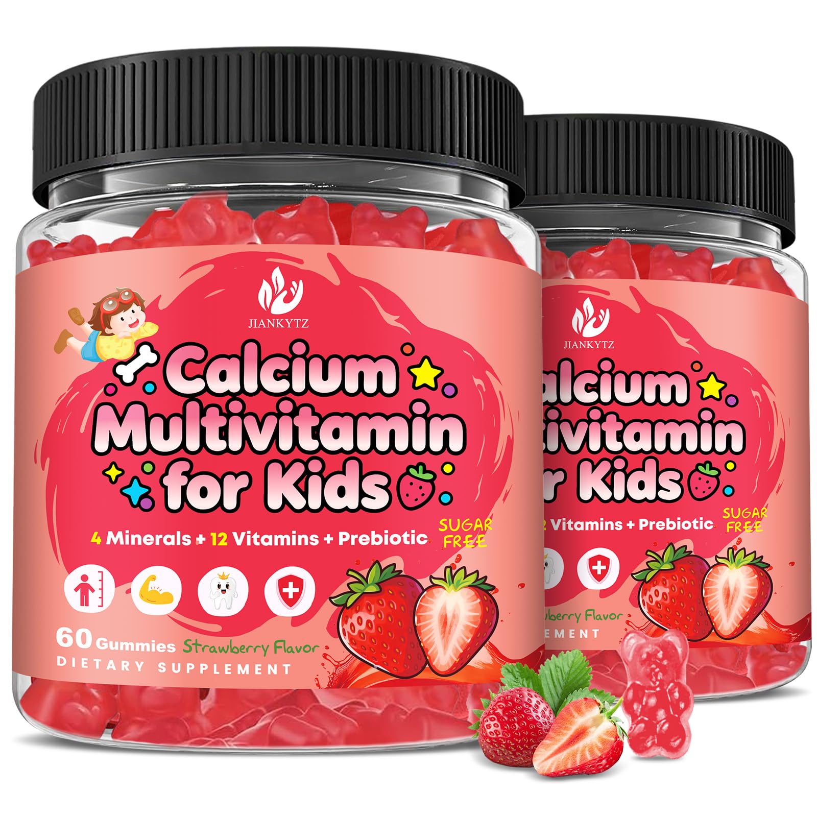 Safe And Reliable: Our Calcium Multivitamin Gummies for Kids contain no gluten, wheat, gelatin, lactose, artificial colours, dairy products or flavours and are non-GMO. Manufactured in a GMP-compliant facility, each batch of our Calcium Multivitamin Gummies for Kids undergoes rigorous quality and purity testing to ensure you receive only the best products for your health journey. If you have any questions please contact us and we will get back to you within 24 hours. Delicious and Easy to Digest: Our calcium multivitamin gummies are specially designed for kids. The formula includes fructooligosaccharides as a prebiotic to help maintain gut health and support digestion. Made with natural monk fruit sweetener, free of artificial sweeteners, these gummies have a soft, chewy texture and a refreshing strawberry flavor, making them a favorite snack for kids. Let your kid get the essential vitamins and minerals they need while growing healthily!. Supporting your child's potential: Our kids Calcium Multivitamin Gummies are rich in essential B vitamins, including B1, B2, B3, B6, B12, and folate , which not only support energy levels but also help kids maintain focus. Our unique formula contains choline, which is beneficial for brain support it also contains vitamins A and C and lutein, which work synergistically to protect vision and provide the nutritional foundation needed for your kids healthy growth and development. Teeth Bones Immune Support: Each delicious calcium multivitamin gummy is rich in calcium citrate, which is more easily absorbed by the body than traditional calcium carbonate. Our unique formula includes vitamin D3 to enhance calcium absorption magnesium and vitamin K2 work synergistically to ensure optimal calcium deposition in bones. In addition, we have added vitamin C and zinc, which have antioxidant properties, to regulate kids immunity and enhance their defenses. Comprehensive Minerals Vitamins: Introducing our Calcium Multivitamin Gummies, a formula containing 4 minerals (calcium, magnesium, zinc, iodine), 12 vitamins (vitamins A, C, D3, E, K2, B1, B2, B6, B12, folic acid, biotin, pantothenic acid), and other nutrients (lutein, choline, prebiotics). These ingredients work synergistically to fill nutritional gaps, support overall healthy development, and provide your kids with essential nutrients.