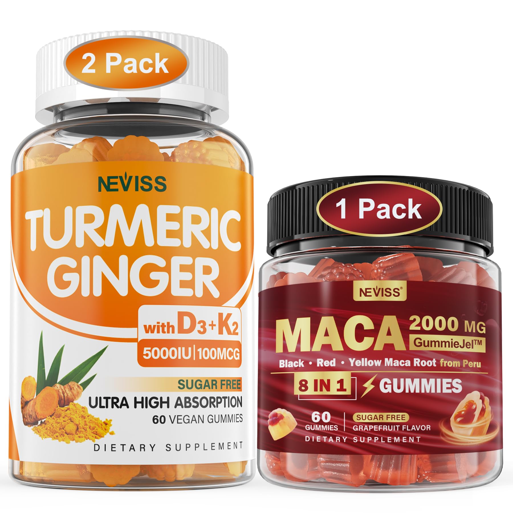 Made in USA Premium Quality Our Turmeric Ginger Maca Root Gummies are 3rd party tested, manufactured and bottled in the USA in a GMP certified facility to ensure exceptional quality and consistency. We offer best quality products for the best value. If you have any question, feel free to contact with us. Why it is Recommended 8-in-1 Formula contains Maca, Ashwagandha, Tribulus, Rhodiola, Ginseng, Zinc, L-Arginine and L-Tyrosine. They does not work through hormone-like effects, but by normalizing hormones. Pure natural, no side effects, not only can let you regain youthful vitality, but also gently and comprehensively regulate body functions. Natural Energy, Mood Immune Support Want to turn up the heat in your love life? This Maca Gummies with Ashwagandha are formulated with special ingredients and nutrients to increase vitality in both men and women while promoting mood, quality of rest and immune-boosting effects. Supports Bone Tooth - Neviss Turmeric Gummies provide 5,000 IU of plant-based vitamin D3 and 100 mcg of vitamin K2 (MK-7) to help your body properly absorb and accurately deliver calcium to support strong healthy bones, teeth and muscles. Turmeric Ginger Black Pepper - Provides you with a pleasant way to support muscle health and flexibility, aid the immune digestive systems and support a healthy immune response. And the addition of organic black pepper maximizes curcumin's bioavailability, increg nutrient absorption by 50 .