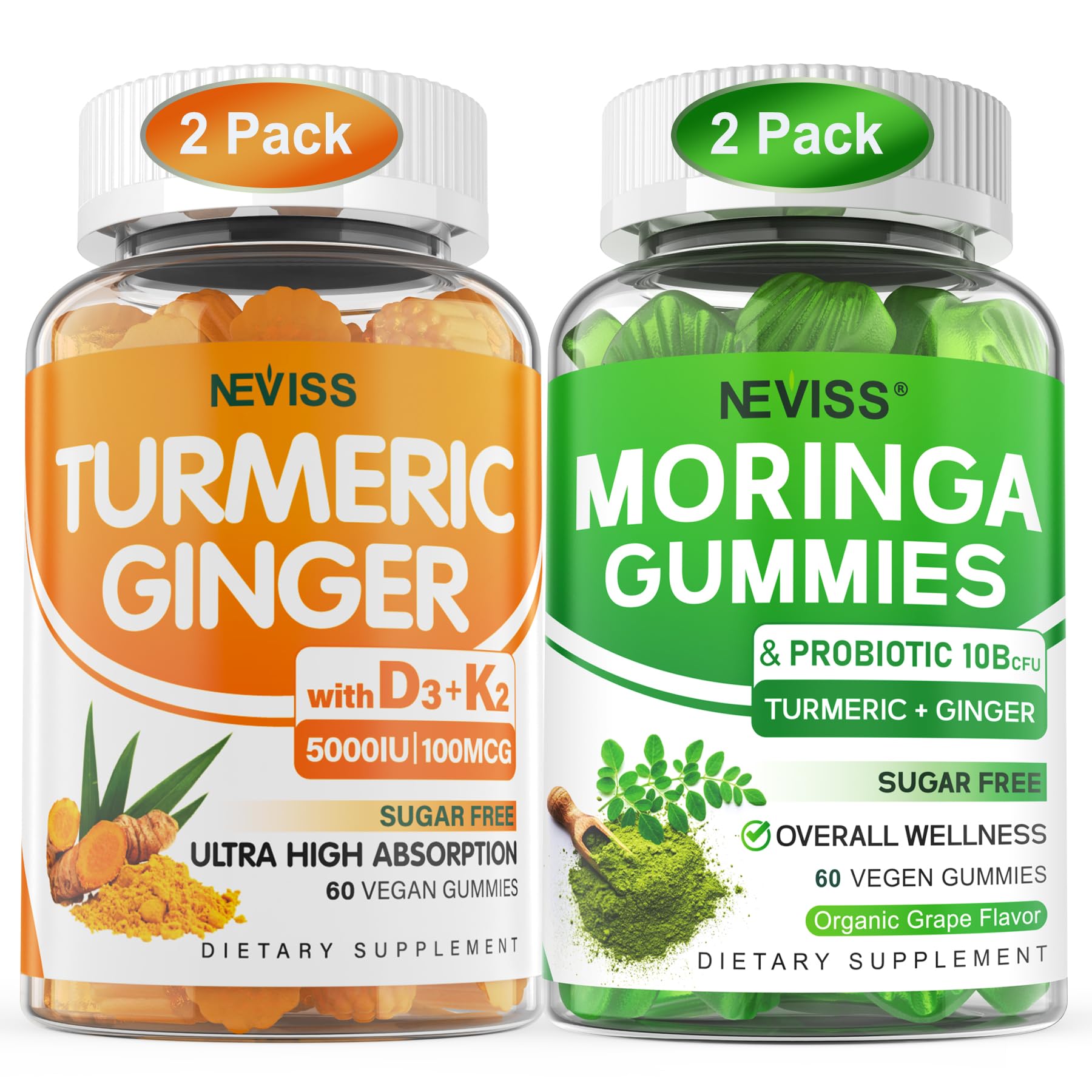 Vegan, Sugar Free, Made in USA - Delicious grape flavor, contains no animal gelatin, sweetened with natural stevia and monk fruit, there is no aftertaste and it is safe for dogs. Free of GMOs, gluten, dairy, soy, sugar, binders, yeast and artificial ingredients and flavors. Plus 10 Billion Probiotic - Moringa is rich in fiber and supplemented with 5 selected probiotic strains to help maintain a healthy balance of intestinal bacteria. Vitamin C from Acerola Cherry works in tandem with other ingredients to provide antioxidant support, healthy aging and digestion. Neviss Moringa Gummies make it easier to maintain healthy levels and curves more comprehensively. All In One Moringa Supplement - Our formula contains Moringa, Turmeric, Ginger, Boswellia, Ceylon Cinnamon and black pepper extracts that work synergistically to provide you with greater health benefits. The result is a more effective and convenient solution to improve energy, mobility balance, and enhance digestive and immune health. Supports Bone Tooth - Neviss Turmeric Gummies provide 5,000 IU of plant-based vitamin D3 and 100 mcg of vitamin K2 (MK-7) to help your body properly absorb and accurately deliver calcium to support strong healthy bones, teeth and muscles. Turmeric Ginger Black Pepper - Provides you with a pleasant way to support muscle health and flexibility, aid the immune digestive systems and support a healthy immune response. And the addition of organic black pepper maximizes curcumin's bioavailability, increg nutrient absorption by 50 .