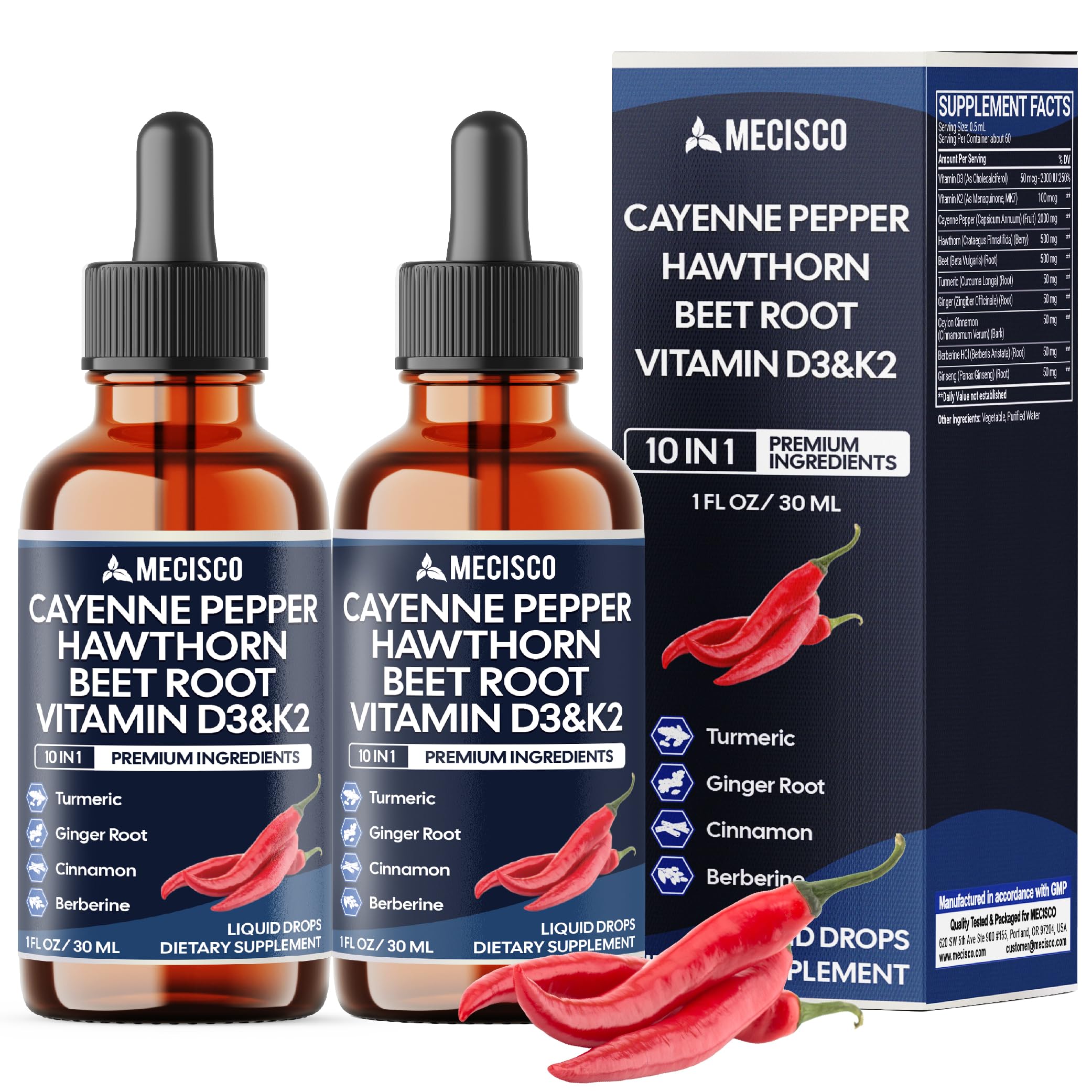 ✓ Satisfaction Guaranteed: Mecisco Bottles are a comprehensive refund policy. Our mission is to offer our customers beneficial supplements of high quality. If, for any reason, you are dissatisfied with your order, please don't hesitate to reach out to us to request a refund. Your satisfaction is our top priority. ✓ Outstanding Value: All Mecisco Supplement is sourced from a trusted certificated facility manufacturer by strict processes to ensure international quality standards such as cGMP, ISO, FDA Registered facility USA verified Laboratory. ✓ Easy Daily Routine: Take 0.5ml of Liquid Cayenne Pepper per day. Each bottle provides a full 2-month supply, easy to take directly or mix with your favorite drink. ✓ Targeted Support: Support heart health, overall vitality, Immune System, and supports Mobility with each serving. ✓ Wellness Support 10 in1 Cayenne Pepper Liquid Supplement blends essential vitamins and herbal extracts like Vitamin D3, K2, cayenne pepper, and hawthorn berry to support heart function, immune balance, and bone strength.