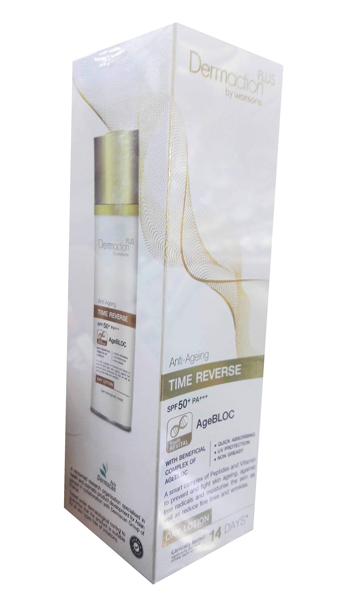 2 Packs of Dermaction Plus by Watsons Anti-Ageing Time Reverse SPF 50+ PA+++ Day Lotion. With beneficial complex of Agebloc. Quick absorbing UV protection Non greasy. (50 ml/pack)