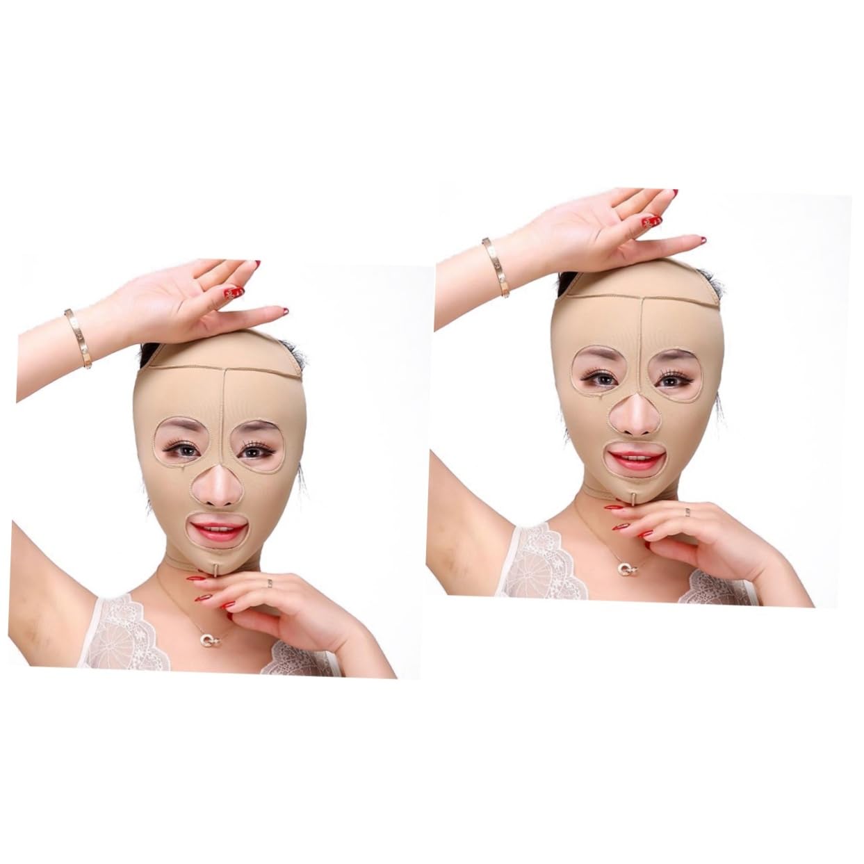 Package Contents: Set of 2 Facial Slimming Bandages - Beauty Tools - Skin Color - Chin Lift - V-Shaped Features: - Type: Face ( ). - Material: Nylon. - Color: Skin color. - Effect: Slimming, facial contouring. - Simple and easy to use. Portable for travel. - It is recommended to use it with a light oil as a moisturizer. - Anti-wrinkle - Full Lift - Thin belt strap to lift cheeks into a V-shape. - Wash in warm water, using a mild detergent, then dry naturally. To minimize the number of washes and prolong the life of this product, brush your hair back to avoid affecting the application and properly clean the area, keeping it dry. - You will need to adjust the application time starting at 15 minutes gradually increase the duration. In general, it is recommended to use it twice a day for about two hours each time, then leave it on for two to three months. - If you have a history of high blood pressure, skin disease, or skin allergies, please use it with caution. - Do not wear it while sleeping use it for cleansing. : Anti-wrinkle product. This item can stimulate metabolism and cleanse facial veins, improve skin elasticity, and rebuild the skin's collagen structure. To wear while sleeping: Wash with warm water, use a mild detergent, and then dry naturally. To minimize the number of washes and prolong the product's lifespan, please keep it clean. Instructions: Keep Clean