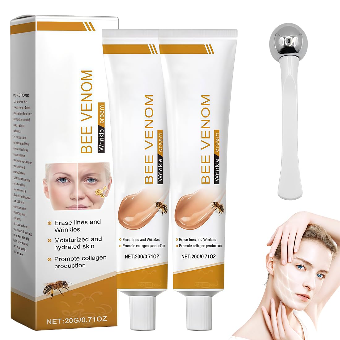 2 produits anti-rides à base de venin d'abeille, adaptés au visage et au cou, Bâton de massage gratuit,conviennent à tous les types de peau.