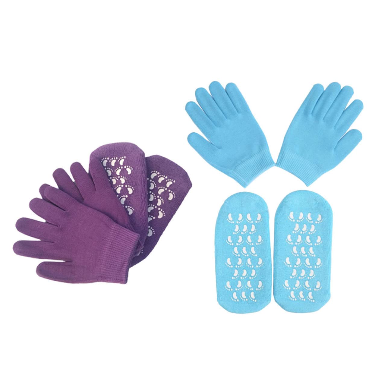 Package List 2 x pairs of gloves 2 x pairs of socks Characteristics - Size: About 19.00X12.00X2.00cm/7.47X4.72X0.79inch women socks. - Material: Phytagel Moisturizing Spa Gloves. - Color: Sky-blue, Purple silicone gloves. - Locks in moisture with non-breathable lining and provide an intensive hydration for your hand and foot skin Gel Gloves Mitts. - Made of , it is and practical in use cosmetology kit. - You can wear them overnight or doing housework. Bring huge convenience for daily life spa socks. - Before putting on gloves and socks, apply hand cream or body lotion, you will get better and obvious moisturizing effect Women Moisturizing Gloves. - Continuously moisturize the skin to restore its natural and healthy appearance, nourish smoothness and increase flexibility features socks for women. Goods Description skincare sets Help to soften your dry, cracked and rough skin on your hands and foot.hand moisturizer gloves Suitable for both women and men.suit set for women the moisturizing process and help your dry, chapped skin more quickly.socks for high heels Whitening, moisturizing, softening, repairing gel gloves for hand and foot skin care
