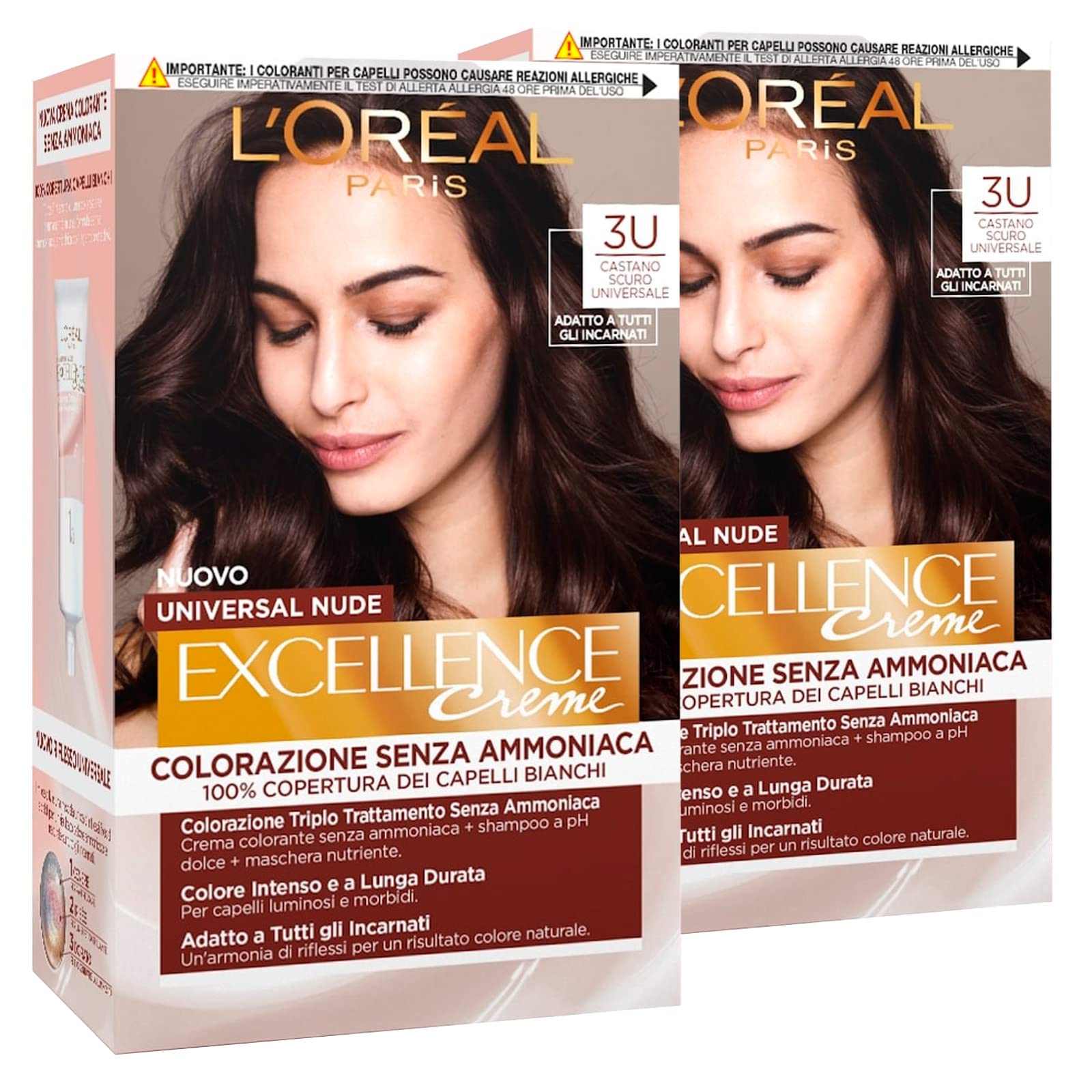 a nuance, an infinite number of complexion.Now it's easier to choose your color.Harmony of reflexes for a natural color result, ideal for the beautification of the complexion of all women.Covers 100 of the white hair, intense and long -lasting color for radiant and soft hair.Permanent coloring without ammonia adapts to any kind of skin tone.This includes: L'Oréal Paris Excellence Creme Universal Nude, dark brown 3U, 2 colors.