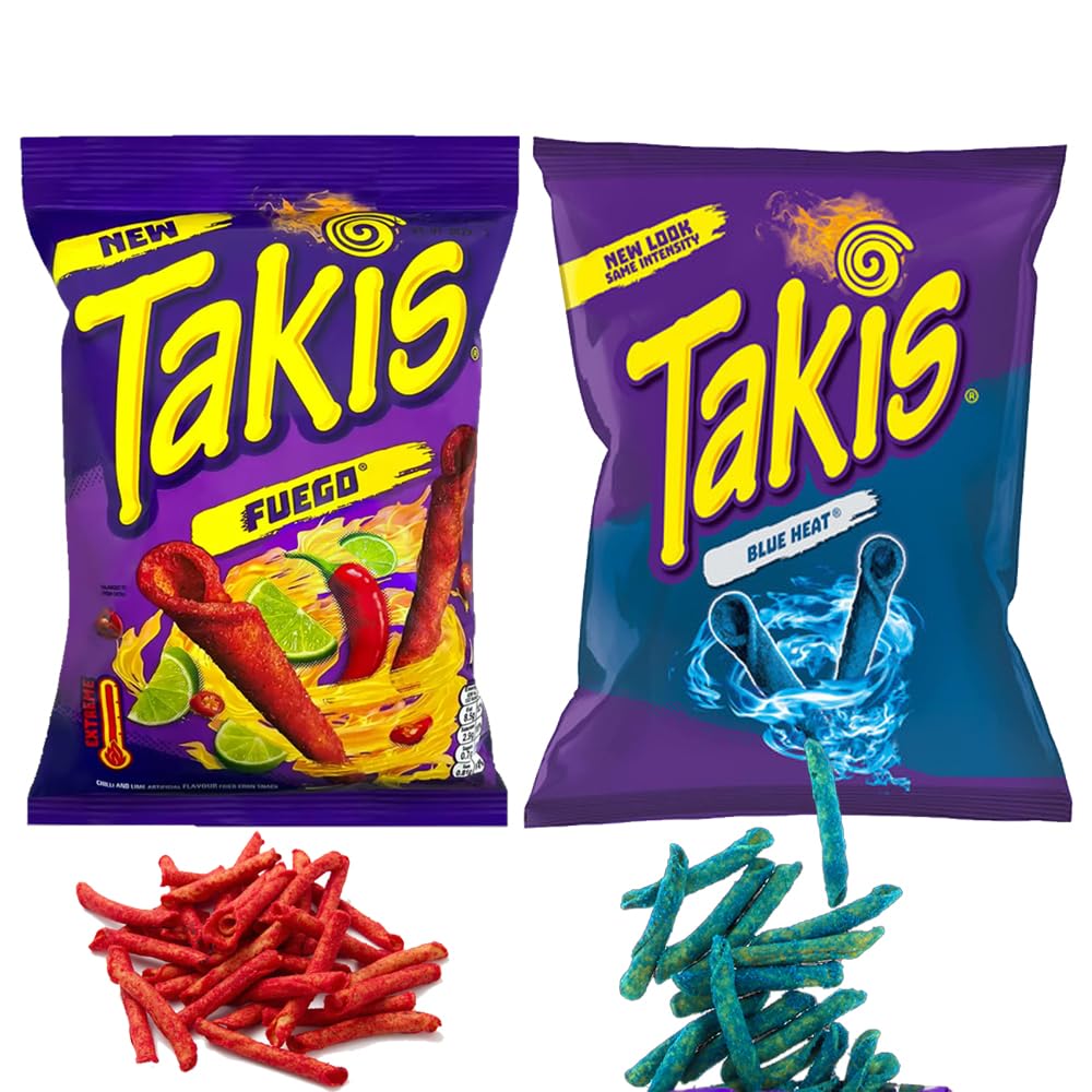 2 x Mixed Takis Fuego Corn Chips Blue Heat Tortilla Chips Takis Fuego Corn Chips 180g - Spicy chili pepper lime flavour corn snack,Rolled tortilla chips Takis Blue Heat Tortilla Chips 92.3g - These spicy tortilla chips are true lime-chili flavour bombs Everyone will love these chips These chips bags are a great lunchtime and afternoon snack Perfect for sharing family friends