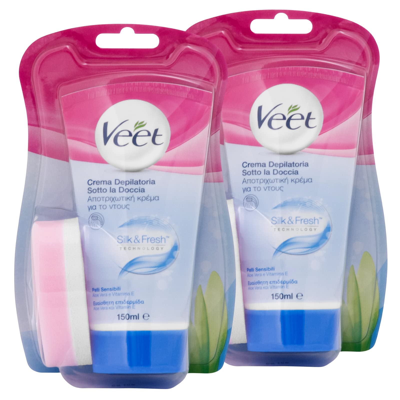 Veet In-Shower Depilatory Cream for Sensitive Skin, with applicator. This cream is formulated to break down the coat's protein structure in minutes, protecting the skin. Moreover, thanks to Silk Fresh technology with aloe vera and vitamin E, it leaves skin smooth and hydrated for 24 hours and prevents unpleasant odors. It can be used on the back, chest, legs, arms, armpits, and groin and is suitable for sensitive skin (always observe usage). The handy included sponge allows for quick and hassle-free removal. Application and Precautions: 1) Apply the cream evenly to the area to be depilated using the soft, colored side of the sponge (dry skin) 2) Wait at least 2 minutes before showering. 3) During the first 3 minutes of showering, avoid direct contact with the water jet on the area to be depilated (it is normal for some cream to slip off during this phase). 4) Leave the cream on for 5 minutes. Remove a small amount with the white side of the sponge and check the condition of the hair removal. If the hair is easily removed and there is no irritation, remove the remaining hair with the sponge in circular motions, depending on the part of the body to be depilated. For stubborn hair, you can leave the gel on for a few more minutes, but do not exceed 10 minutes in total. 5) Rinse the skin thoroughly with water to remove any gel residue, then dry the skin. Wait at least 72 hours between hair removal sessions. If itching or burning occurs, remove the cream immediately and rinse thoroughly with water. INSTRUCTIONS FOR USE 1) Apply the cream evenly to the area to be depilated (dry skin) using the soft, colored side of the sponge. 2) Wait at least 2 minutes before showering. 3) Avoid direct water jets on the area to be depilated for the first 3 minutes of showering (it is normal for some cream to slip off). 4) Leave the cream on for 5 minutes. Remove a small amount with the white side of the sponge and check the condition of the hair removal. If the hair is easily removed and there is no irritation, remove the remaining hair with the sponge in circular motions, depending on the area of the body to be depilated. For stubborn hair, you can leave the gel on for a few minutes longer, but do not use it for longer than 10 minutes. 5) Rinse the skin thoroughly with water to remove any gel residue and then dry. Wait at least 72 hours between hair removal sessions. If itching or burning occurs, remove the cream immediately and rinse thoroughly with water. SAFETY WARNING: Test the product on a small area before use. Avoid contact with eyes and mucous membranes. Stop use if any signs of irritation occur. View moreWait at least 72 hours between hair removals. For stubborn hair, you can leave the gel on for a few minutes longer, but not more than 10 minutes per use. Thanks to the practical sponge, quick and worry-free drainage is possible. Silk Fresh technology with aloe vera and vitamin E leaves the skin smooth and provides it with moisture for 24 hours. The set contains: 2 x VEET Silk Fresh Hair Removal Cream, 150 ml.2 x VEET ontharingscrème voor onder de douche, Silk Fresh-technologie voor de gevoelige huid, 2 flessen van elk 150 ml 2 x onder de douche voor de gevoelige huid Veet Ontharingscrème onder de douche voor de gevoelige huid, met applicator. Deze crème is ontwikkeld met een formule die in staat is om de eiwitstructuur van de vacht binnen enkele minuten los te maken en de huid te beschermen. Bovendien laat het dankzij de Silk Fresh-technologie met aloë vera en vitamine E de huid 24 uur lang glad en gehydrateerd en zorgt het ervoor dat er geen onaangename geuren ontstaan. Kan op rug, borst, benen, armen, oksels en lies worden gebruikt en is geschikt voor de gevoelige huid (altijd rekening houdend met het gebruik). Dankzij de praktische meegeleverde spons is een snelle en zorgeloze afvoer. Toepassing en voorzorgsmaatregelen: 1) Breng de crème gelijkmatig aan op de te ontharen plek met de zachte en gekleurde kant van de spons (droge huid) 2) wacht ten minste 2 minuten voordat je in de douche stapt. 3) Tijdens de eerste 3 minuten tijdens het douchen vermijden dat de waterstraal direct op de te ontharen plaats stoot (in deze fase is het normaal dat er wat crème wegglijdt). 4) Laat de crème inwerken. voor 5 minuten verwijderen Doe een kleine hoeveelheid met de witte kant van de spons en controleer de toestand van het ontharen. Als het haar gemakkelijk wordt verwijderd en er geen irritatie is, verwijder dan de rest met de spons in cirkelvormige bewegingen, afhankelijk van welk deel van het lichaam moet worden verwijderd. Bij hardnekkig haar kun je de gel enkele minuten langer laten inwerken, maar niet het totale gebruik 10 minuten overschrijden 5) Spoel de huid grondig af met water om gelresten te verwijderen, vervolgens droog hem af. Wacht ten minste 72 uur tussen de ontharingen. Bij jeuk of verbranding de crème onmiddellijk verwijderen en grondig met water afspoelen. GEBRUIKSAANWIJZING 1) Breng de crème met de zachte, gekleurde kant van de spons gelijkmatig aan op de te ontharen plaats (droge huid). 2) Wacht ten minste 2 minuten voordat je onder de douche stapt. 3) Voorkom de eerste 3 minuten bij het douchen de waterstraal direct op de te ontharen plaats (het is normaal dat er wat crème wegglijd) 4) Laat de crème 5 minuten inwerken. een kleine hoeveelheid verwijderen met de witte kant van de spons en controleer de toestand van het ontharen. Als het haar gemakkelijk wordt verwijderd en er geen irritatie is, verwijder dan de rest met de spons in cirkelvormige bewegingen, afhankelijk van welk deel van het lichaam moet worden verwijderd. Bij hardnekkig haar kun je de gel een paar minuten langer laten inwerken, maar niet langer dan 10 minuten gebruiken. 5) Spoel de huid grondig af met water om gelresten te verwijderen en vervolgens af te drogen. Wacht ten minste 72 uur tussen de ontharingen. Bij jeuk of verbranding de crème onmiddellijk verwijderen en grondig met water afspoelen. VEILIGHEIDSWAARSCH
