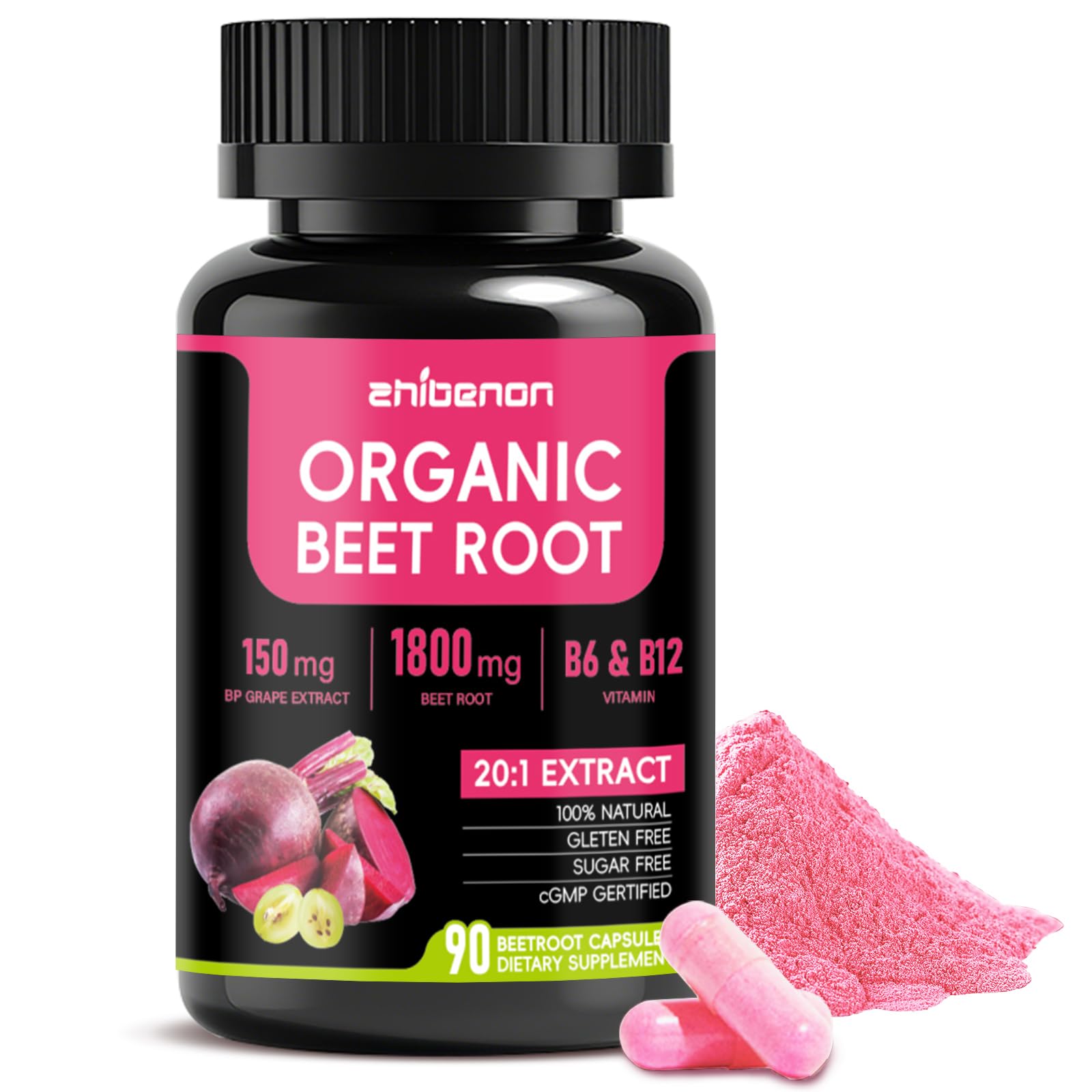 100 Natural cGMP GERTIFIED: All ingredients are rigorously tested for potency and purity. The capsules contain powder from 100 Natural beets dried at low temperatures and finely ground. This process helps preserve the natural nutrients, ensuring maximum absorption and benefits. Daily Capsule for Energy Health: Made from non-GMO organic beets, our beet root supplements are free of sugar, dairy, and soy. Ideal for daily use by various groups such as those with low energy, fitness enthusiasts, individuals with imbalanced diets, vegans vegetarians, people focused on heart health, and those seeking anti-aging and skin wellness benefits. Supporting Healthy Circulation Vitality: Beetroot supplement help support heart health and normal blood circulation, providing natural energy supplementation for daily performance and physical strength of men women the aged students office workers. They are rich in antioxidants, which can help the heart from oxidative stress damage and contribute to overall heart health. Easy to Take Consistent Dosage: Some find beetroot powder tastes earthy even in smoothies. Our easy-to-swallow beetroot capsules deliver a precise, controlled dose daily. You can enjoy all the benefits of beetroot without the natural taste or the mess of mixing powder—no more kitchen or tabletop cleanup!. High Concentration Potency: Each serving of our organic beet root capsules is packed with 1800mg of beet root extract, 150mg of grape seed extract, and 25mg of hawthorn powder. Rich in vitamins B6 and B12, they meet the body's daily nutritional needs, making it one of the most advanced beetroot complex formulas available.