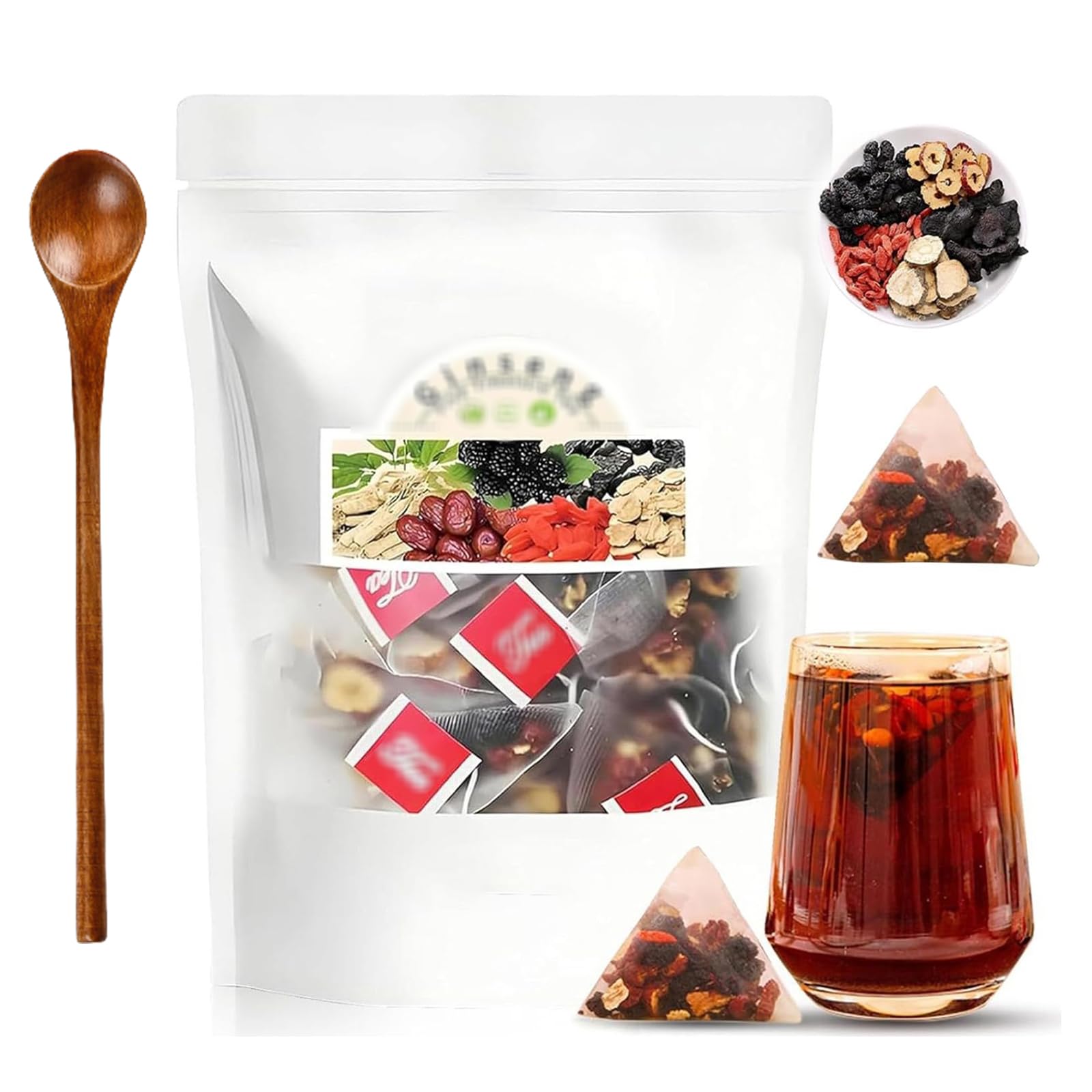 Specifications: Product name: Ginseng and wolfberry tea Product Type: Tea Shelf Life:12 Months Package contents include: 1Pack Ginseng six treasure tea(1 Pack 20 Bags) 1Pcs Spoon Note : 1,Manual measurement, please forgive me if there is any error. 2,Due to different monitors and different lighting, the picture may not show the actual color of the item. Thank you for your understanding. 3,Your 100 satisfaction with the shopping experience is our real goal. If you have any confusion before or after ordering, please don't be stingy with your email. Let us know and we will reply within 12 hours and solve the problem for you.Storage Method: Storage sealed, dry, low temperature. Note: The printing time is the production date, not the expiration date. Convenient to Use: Take out the tea bag and put it into a cup, pour an appropriate amount of boiling water, and soak for 3-6 minutes to get a cup of healthy herbal tea. Natural Ingredients: Ginseng Five Treasures Tea combines the rich flavors of red dates, goji berries, mulberries, yellow essence, and ginseng. Ginseng Six Treasure Tea: Ginseng Six Treasure Tea is a good tea, which is suitable for people who always stay up late, like to drink or work fatigued.20 Bags Ginseng Mulberry Herbal Tea, Ginseng And Wolfberry Tea Organic, Kidney Teas Formula, Ginsengs Mulberry Herbal Teas for Men Women Specifications: Product name: Ginseng and wolfberry tea Product Type: Tea Shelf Life:12 Months Package contents include: 1Pack Ginseng six treasure tea(1 Pack 20 Bags) 1Pcs Spoon Note : 1,Manual measurement, please forgive me if there is any error. 2,Due to different monitors and different lighting, the picture may not show the actual color of the item. Thank you for your understanding. 3,Your 100 satisfaction with the shopping experience is our real goal. If you have any confusion before or after ordering, please don't be stingy with your email. Let us know and we will reply within 12 hours and solve the problem for you.Storage Method: Storage sealed, dry, low temperature. Note: The printing time is the production date, not the expiration date. Convenient to Use: Take out the tea bag and put it into a cup, pour an appropriate amount of boiling water, and soak for 3-6 minutes to get a cup of healthy herbal tea. Natural Ingredients: Ginseng Five Treasures Tea combines the rich flavors of red dates, goji berries, mulberries, yellow essence, and ginseng. Ginseng Six Treasure Tea: Ginseng Six Treasure Tea is a good tea, which is suitable for people who always stay up late, like to drink or work fatigued.
