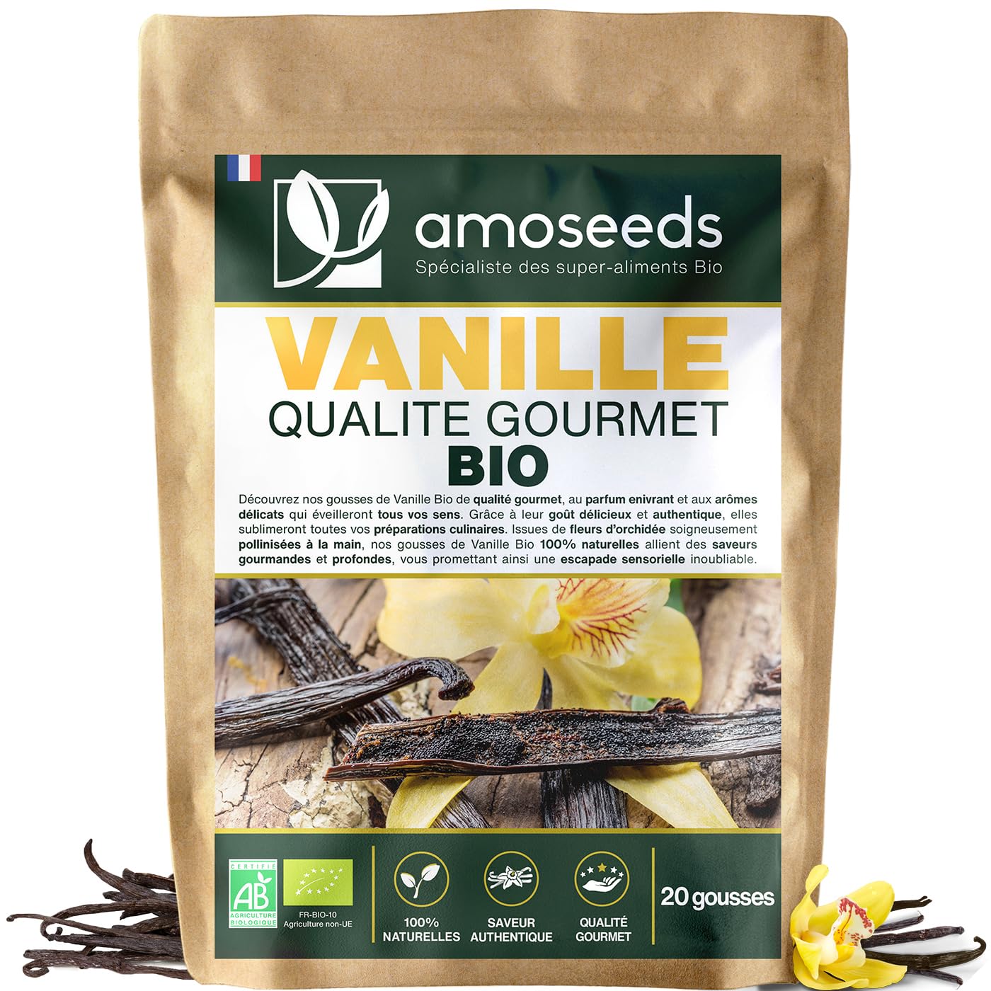 ? CERTIFIÉES BIOLOGIQUES : sachet Kraft refermable contenant des gousses de Vanille Bio de Qualité Gourmet amoseeds. Produit 100 naturel, pur, vegan, sans additifs, sans conservateurs, sans OGM, sans pesticides, sans arômes artificiels, sans lactose, sans soja et sans gluten. Chaque lot est testé par des tiers afin de s'assurer de leur qualité et leur pureté. ? LONGUE CONSERVATION : nos gousses de Vanille Bio sont placées dans des sachets kraft refermables dotés d'une doublure en aluminium 100 hermétique. Vous pouvez ainsi conserver vos gousses de Vanille Bio dans leur emballage d'origine jusqu'à 24 mois sans qu'elles ne se dessèchent ou ne perdent en saveurs. ? 100 PURES ET NATURELLES : nos gousses de Vanille Bio sont issues de la plante d'orchidée cultivée selon un savoir-faire traditionnel minutieux. Chacune des gousses est récoltée à la main avec le plus grand soin avant de passer par un processus de maturation naturel. Cela permet d'obtenir des gousses de 11 à 15cm, charnues, très parfumées, aux arômes naturels puissants et sans conservateurs. ? HAUTE QUALITÉ GOURMET, PARFUM INTENSE : nous avons sélectionné des gousses de Vanille de qualité Gourmet afin que vous puissiez profiter de tous les arômes profonds et gourmands de cette épice d'exception. Leur parfum intense et leur richesse en saveurs vous permettront même de réaliser du sucre vanillé maison. ? SAVEUR AUTHENTIQUE, GOURMANDE : nos gousses de Vanille Bio regorgent de petits grains noirs au parfum intense et aux saveurs gourmandes. Grâce à leurs notes caramélisées et légèrement florales, ces gousses sublimeront vos crèmes brûlées, crèmes anglaises, flan, cakes, tiramisus et autres desserts !.