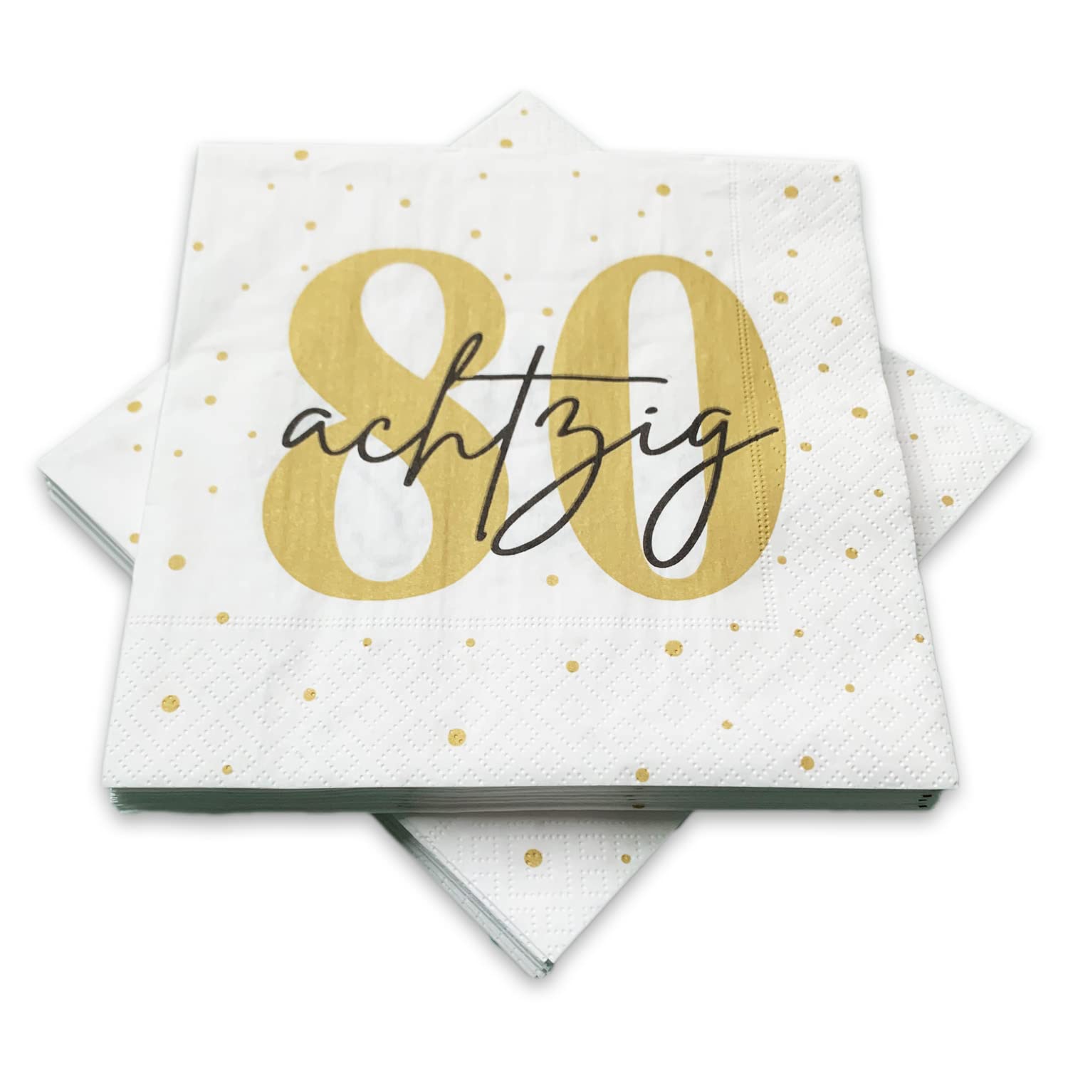 20 napkins for 80th birthday 33x33 cm - white gold black