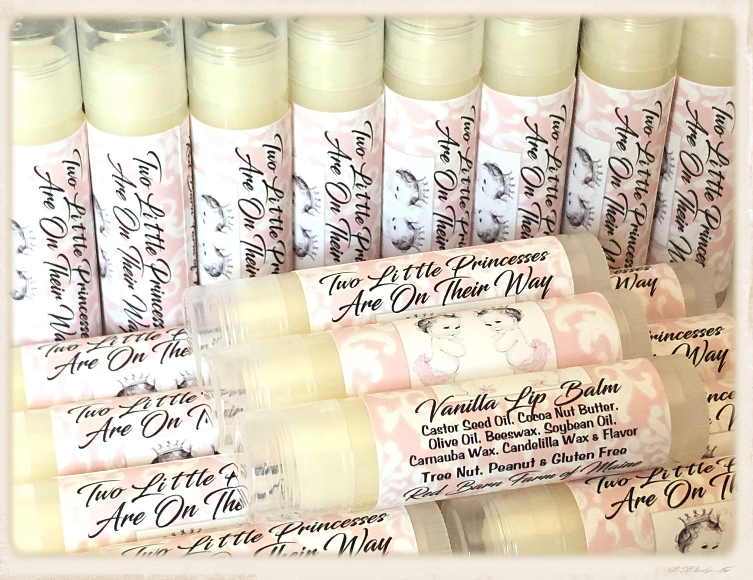 Made Fresh the Day You Order and Have a One Year Shelf Life. We have Other Listings Available for Other Occassions. Tubes are MADE IN THE USA and are BPA Free. They are Round, Full Size, .15oz and are Clear with Clear Caps. Handmade and are Peanut, Gluten, Paraben and Tree Nut Free. Use the Customized It Button to Send Me the Wording. I Will Format the Text to Match the Examples and Send You a Proof Before Printing. 20 Handmade Personalized Vanilla Flavored Lip Balms with Your Baby Girls Names on Them.