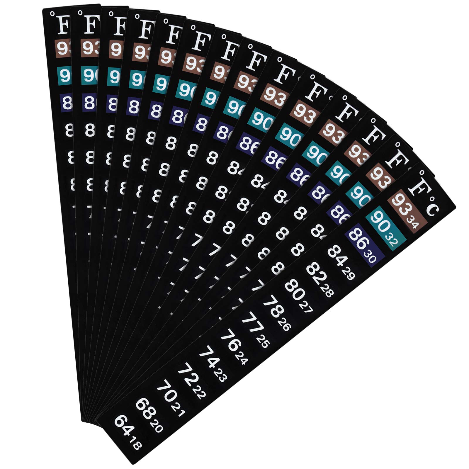 "Measuring range: the stick-on digital temperature strip measures both Fahrenheit and Celsius degree, Celsius degree in the range of 18 to 34 °C, and Fahrenheit degree in the range of 64 to 93 °F". "Monitor temperature: our digital temperature sticker is suitable for monitor temperature of fish tank and aquarium, can keep fishes, shrimps, reptiles or turtles comfortable by making sure the water isn't too hot or too cold; Also can be applied to measure the temperature of your DIY drinks and wine barrel, terrarium and any sort of pet tank". "Easy to read: the fish tank thermometer strip has 3 colored marking that can indicate the temperature situation, which can change with the water temperature, each color represents different water temperature condition, they can be seen clearly and quickly from the surface". "Easy to stick: our aquarium thermometer sticker features adhesive design, just peel off the tape and attach to surface of aquarium, fish tank and others; After about 2 to 5 minutes, the colored change will indicate the exact temperature; Please keep it away from any heat source". "Package quantity: there are 20 pieces digital temperature sticker in the package, enough quantity to meet your long time using and use for different occasions; The adhesive temperature strip measure approx. 13 x 2 cm/ 5.1 x 0.8 in in length and width, proper size to fit most surfaces".