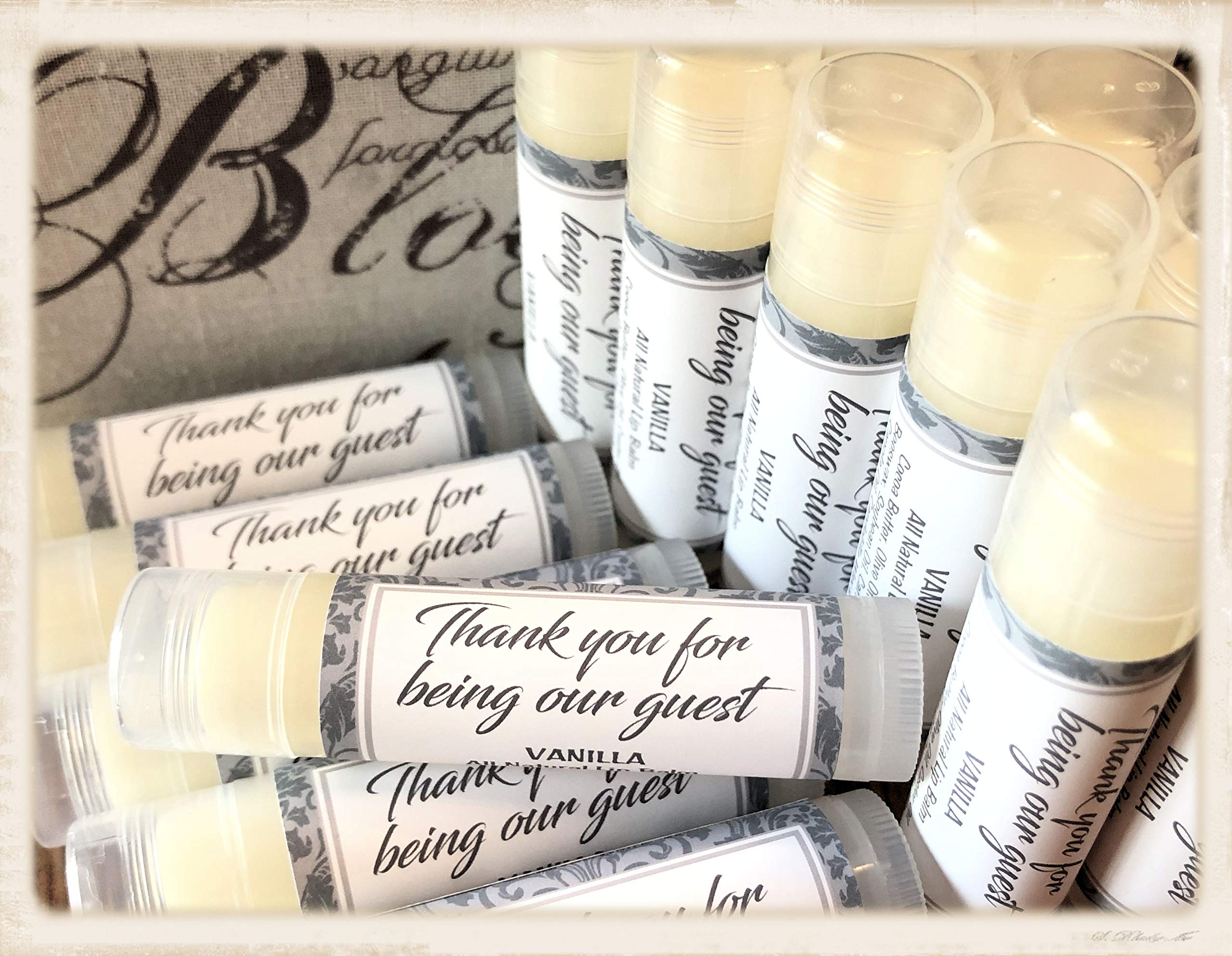 Contact Us if You Would Like Them Customized with Your Business Name and or Logo on Them. Tubes are MADE IN THE USA, are PBA Free, Full Size, Round and .15oz. Expires One Year After Purchase. Peanut, Gluten, Paraben and Tree Nut Free - Lip Balms are Poured Individually So that the Tops are Smooth. Comes with the Phrase "Thank You for Being Our Guest" on Them. Labels are Waterproof and Smearproof. 20 Vanilla Lip Balms in Clear Tubes and Caps - Perfect Gift for Your Rental, Hotel or B B Guests.