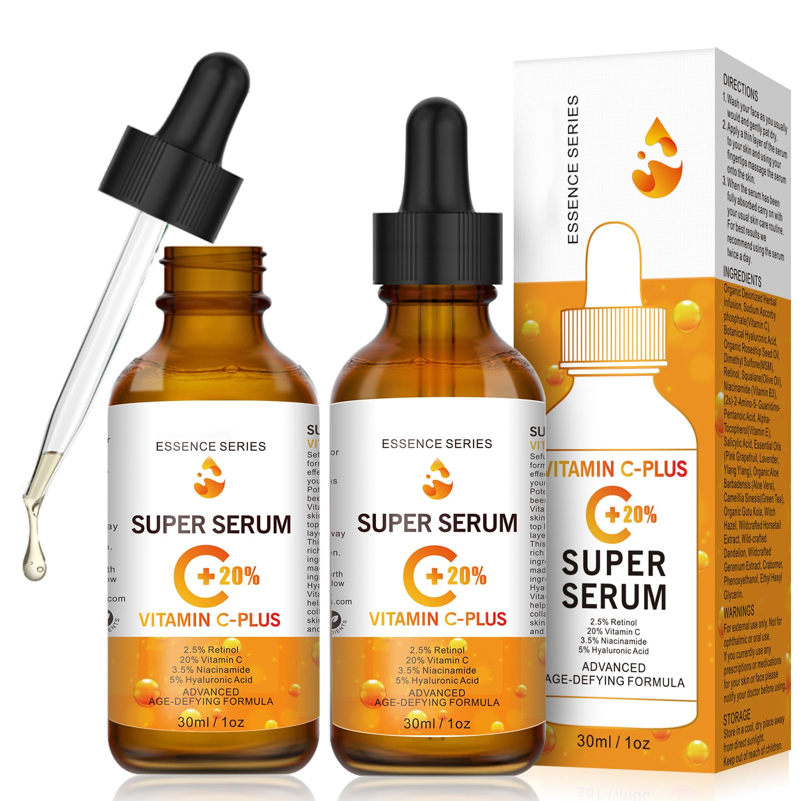 The aging process naturally reduces moisture, collagen and important skin nutrients, which makes the skin dry, wrinkled and impure.Our vitamin C serum was specially developed for the revitalization of aging skin and provides the most important nutrients that are required to restore a beautiful, young people's appearance. Antioxidants play an important role in the health of the skin, and vitamin C is known for its ability to restore skin health by nourishing and renewing the skin cells. Our highly effective vitamin C serum formula was developed with 20 stabilized vitamin C, which penetrates the layers of the skin and remains stable from the top to the deepest layer of skin. This effective vitamin C serum contains a rich mix of the best skin-friendly ingredients that nature has to offer, produced from natural vegetable ingredients such as aloe vera, hyaluronic acid, green tea, retinol, vitamin C, b3 and e as well as etheric oilsIn doing so, increg the moisture content and increg collagen production, which improves the elasticity of the skin and your complexion is tightened, smoothed and brightened. Can be used twice a day (in the morning and evening).However, we recommend using the product once a day, up to twice a day. 1. Wash your face as usual and dab it dry. 2. Apply a thin layer of serum to the desired areas. 3. Let dry. 4. After the serum is completely dry, apply your preferred moisturizer. Warnings: For external use only.Not suitable for ophthalmological or oral application.If you are currently using recipes or medication for your skin or faceYoung people and radiant skin: After only a few weeks of care, you will already reduce fine lines and wrinkles, more liveliness and shine of the skin as well as a decrease in sunspots andFind discoloration.The formula provides immediate moisture and maximizes the moisture memory, this serum is a treat for all skin types, regardless of sound or skin color.Intensive anti -aging care: This vitamin C face serum helps against wrinkles, eye folds, fine lines, dark circles, age spots, acne scars and hyperpigmentation and stains caused by age or sun.With hyaluronic acid: It counteracts the age-related hyalurone loss of the skin in order to effectively rejuvenate your skin and reduce signs of skin aging.Due to the high skin compatibility, Hyaluron facial serum can also be used as an eye cream and in the eye area.With 20 highly concentrated vitamin C : Vitamin C supports the formation of collagen, the building block for a young, wrinkle -free skin.It catches free radicals that make the skin age prematurely, promotes the formation of collagen, which is responsible for the elasticity of the connective tissue and helps to lighten up old and pigment spots.Anti-aging serum for the face and cleavage: The optimal combination of vitamin C and hyaluronic acid in this serum helps to protect your skin's natural and adolescent look.Der Alterungsprozess verringert auf natürliche Weise Feuchtigkeit, Kollagen und wichtige Hautnährstoffe, wodurch die Haut trocken, faltig und unrein wird. Unser Vitamin-C-Serum wurde speziell für die Revitalisierung alternder Haut entwickelt und liefert die wichtigsten Nährstoffe, die für die Wiederherstellung eines schönen, jugendlichen Aussehens der Haut erforderlich sind. Antioxidantien spielen eine wichtige Rolle für die Gesundheit der Haut, und Vitamin C ist für seine Fähigkeit bekannt, die Hautgesundheit wiederherzustellen, indem es die Hautzellen nährt und erneuert. Unsere hochwirksame Vitamin-C-Serumformel wurde mit 20 stabilisiertem Vitamin C entwickelt, das in die Hautschichten eindringt und von der obersten bis zur tiefsten Hautschicht stabil bleibt. Dieses wirksame Vitamin-C-Serum enthält eine reichhaltige Mischung der besten hautfreundlichen Inhaltsstoffe, die die Natur zu bieten hat, hergestellt aus natürlichen pflanzlichen Inhaltsstoffen wie Aloe Vera, Hyaluronsäure, grünem Tee, Retinol, Vitamin C, B3 und E sowie ätherischen Ölen Helfen Sie dabei, den Feuchtigkeitsgehalt zu steigern und die Kollagenproduktion zu steigern, wodurch die Elastizität der Haut verbessert wird und Ihr Teint gestrafft, geglättet und aufgehellt wird. Kann zweimal täglich (morgens und abends) angewendet werden. Wir empfehlen jedoch, das Produkt einmal täglich zu verwenden, bis zu zweimal täglich. 1. Waschen Sie Ihr Gesicht wie gewohnt und tupfen Sie es trocken. 2. Tragen Sie eine dünne Schicht Serum auf die gewünschten Stellen auf. 3. Trocknen lassen. 4. Nachdem das Serum vollständig getrocknet ist, tragen Sie Ihre bevorzugte Feuchtigkeitscreme auf. WARNHINWEISE: Nur für äußere Anwendung. Nicht zur ophthalmologischen oder oralen Anwendung geeignet. Wenn Sie derzeit Rezepte oder Medikamente für Ihre Haut oder Ihr Gesicht verwendenJUGENDLICHE UND STRAHLENDE HAUT: Nach nur wenigen Wochen der Pflege werden Sie bereits eine Reduzierung von feinen Linien und Falten, mehr Lebendigkeit und Glanz der Haut sowie eine Abnahme von Sonnenflecken und Verfärbungen feststellen. Die Formel liefert sofortige Feuchtigkeit und maximiert den Feuchtigkeitsspeicher, dieses Serum ist eine Wohltat für alle Hauttypen, unabhängig von Ton oder Hautfarbe. INTENSIVE ANTI AGING PFLEGE: Diese Vitamin C Gesichtsserum helfen gegen Falten, Augenfalten, Feine Linien, Augenringe, Altersflecken, Aknenarben und Hyperpigmentierung und Flecken, die durch Alter oder die Sonne verursacht wurden. MIT HYALURONSÄURE: Sie wirkt dem altersbedingten Hyaluron-Verlust der Haut entgegen, um Ihre Haut effektiv zu verjüngen und Zeichen der Hautalterung zu vermindern. Hyaluron Gesichtsserum kann aufgrund der hohen Hautverträglichkeit auch als Augencreme sowie im Augenbereich verwendet werden. MIT 20 HOCHKONZENTRIERTEM VITAMIN C: Vitamin C unterstützt die Bildung von Kollagen, dem Baustein für eine jugendliche, faltenfreie Haut. Es fängt freie Radikale, welche die Haut vorzeitig altern lassen, fördert die Bildung von Kollagen, welches für die Elastizität des Bindege