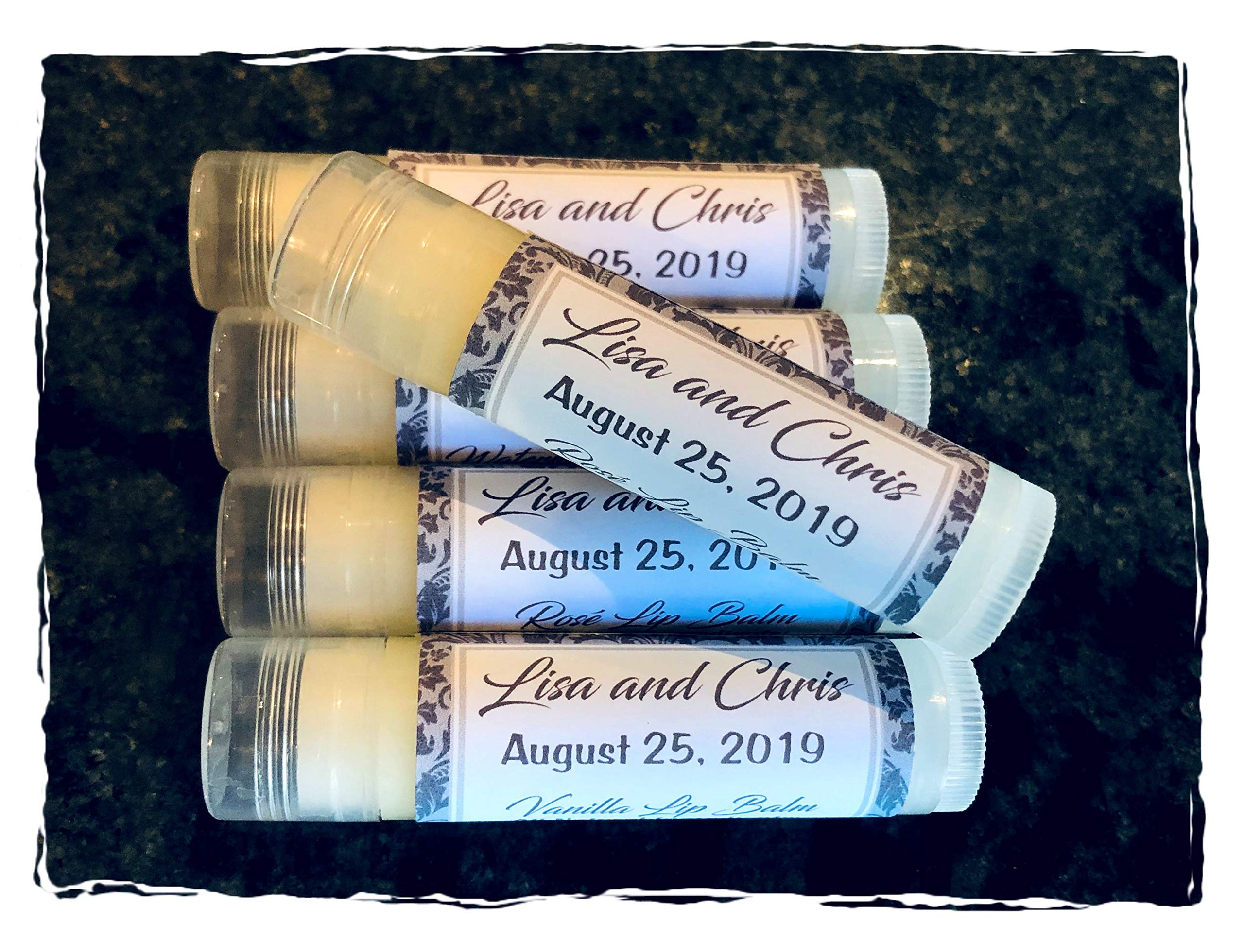 20 WEDDING Personalized Lip Balms in a Grey Damask Background - Vanilla