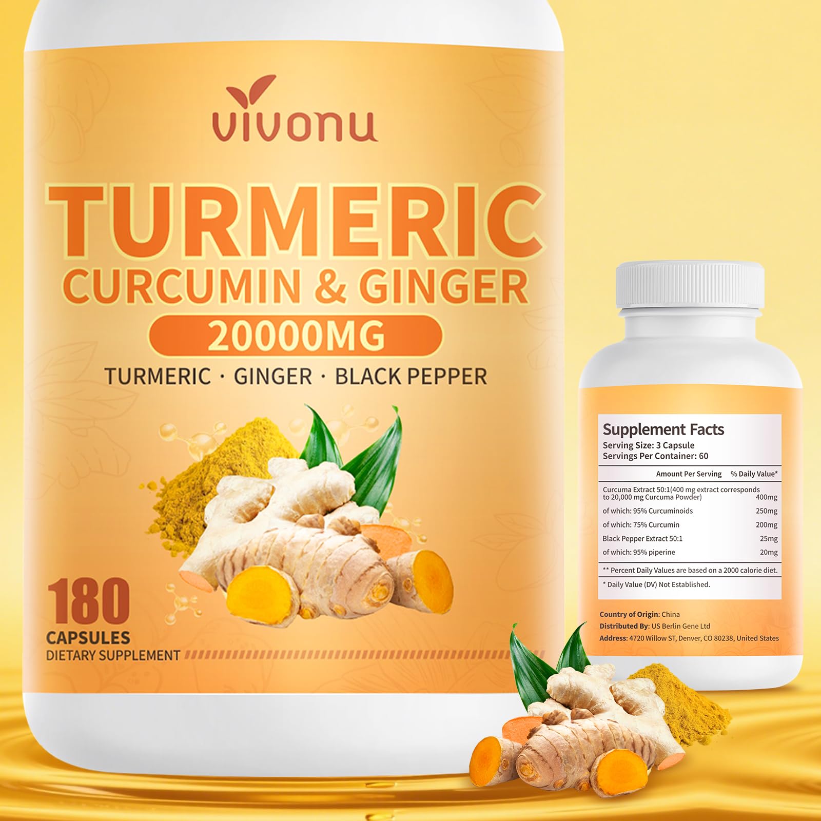 20000mg Turmeric Curcumin Supplement with Black Pepper, 180 Capsules, 95 Curcuminoids, Turmeric and Ginger Supplement,Herbal Supplement for Antioxidant, Anti-inflammatory , Immunity, Comfort Joint