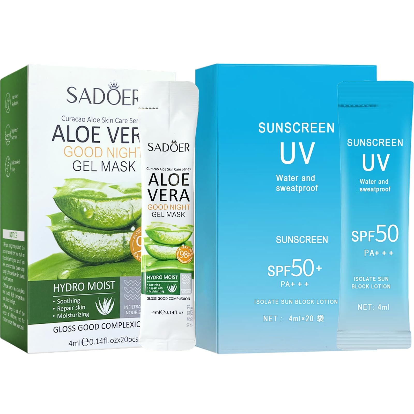 Perfect Bulk Gifts for Women Sunscreen aloe vera gel comes in large quantities and is an excellent skincare gift for women,wife, mother,grandmother and girlfriend.they are perfect mothers day gift,teacher appreciation gifts,nurses week gifts,christmas gifts and birthday gifts. No Grease, No Residue Both products feature a water-based formula – glides on smoothly, dries quickly, and won't clog pores. Oil-free, non-comedogenic, and suitable for all skin types (face body). Instant Hydration Soothing Infused with natural aloe vera, the cooling gel calms sun-exposed skin, and locks in moisture without stickiness. Great for post-sun, post-workout, or dry skin relief. Broad-Spectrum Sun Protection Lightweight, fast-absorbing sunscreen provide reliable SPF coverage (UVA UVB) without white cast. Waterproof sweat-resistant for swimming, surfing, or outdoor sports. Convenient Travel-Ready 20PCS sunscreen 20PCS aloe vera gel – perfect size for on-the-go sun protection and soothing aftercare. TSA-friendly, ideal for travel, beach trips, hiking, or daily commutes.