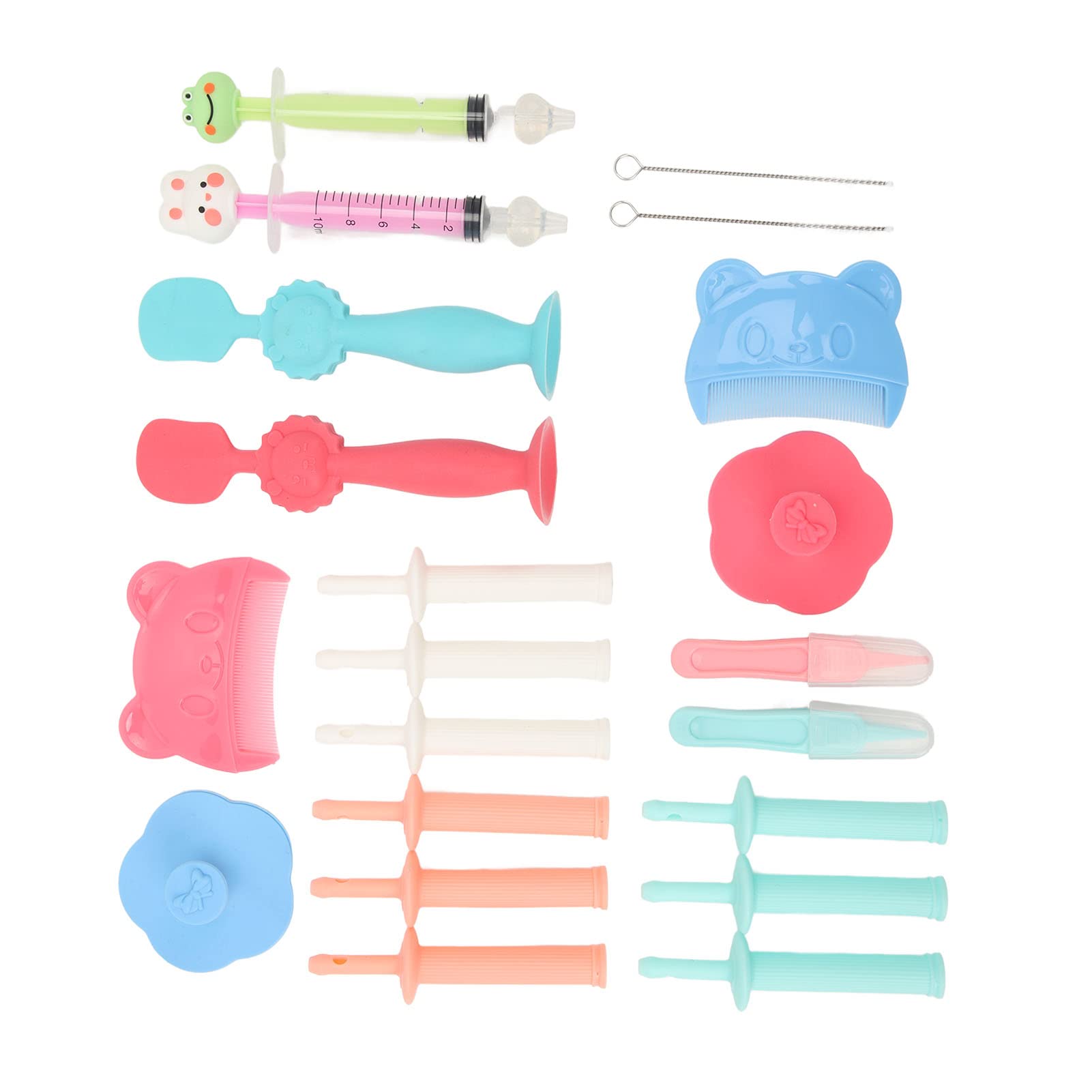 Spec: Item Type: Baby Grooming Kit Material: Silicone Package List: 2 x Nasal Aspirator 9 x Baby Gas Reliever 2 x Baby Tweezers 2 x Medicine Brush 2 x Cleaning Brush 2 x Brush 2 x Comb