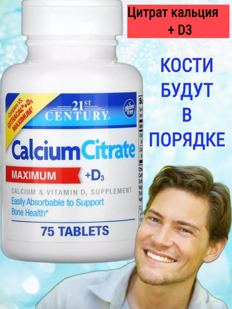 Пищевая добавка 21st Century содержит цитрат кальция и витамин D3 для поддержки прочности костей и иммунитета.