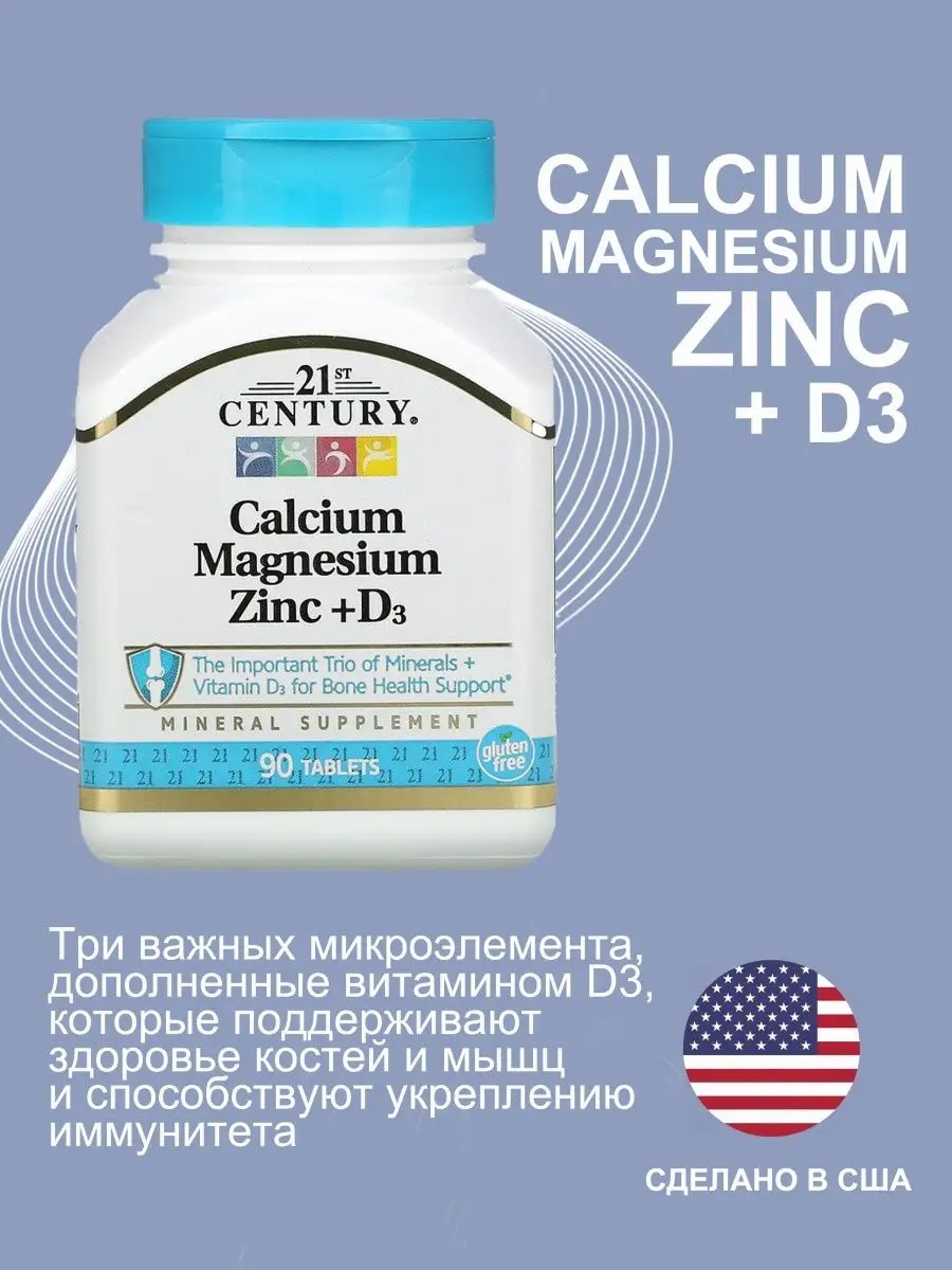 Calcium Magnesium Zinc+D3 Специально разработанный американский комплекс 3 минералов,которые усиливают действие друг друга. Обеспечивает укрепление костной ткани, зубов и ногтей, а также регулирует работу мышц. Улучшает состояние волос и кожи.**Кальций** укрепляет костную ткань,зубную эмаль и ногтевую пластину. Регулирует кровяное давление.**Магний** улучшает сокращение мышц,регулирует сердечный ритм и ускоряет восстановление энергии. Стабилизирует нервную систему и усиливает стрессоустойчивость,как следствие восстанавливает здоровый вид волос.**Цинк** улучшает обмен веществ и способствует выведению токсинов, защищает клетки организма от повреждений радикалами,регулирует гормональный баланс. В комплексе с **витамином D3** укрепляет иммунную систему.**Витамин D3** способствует улучшению усвоения данных минералов.Взрослым принимать по 1 таблетке 3 раза в день обязательно во время или сразу после еды. С уважением компания 21st century