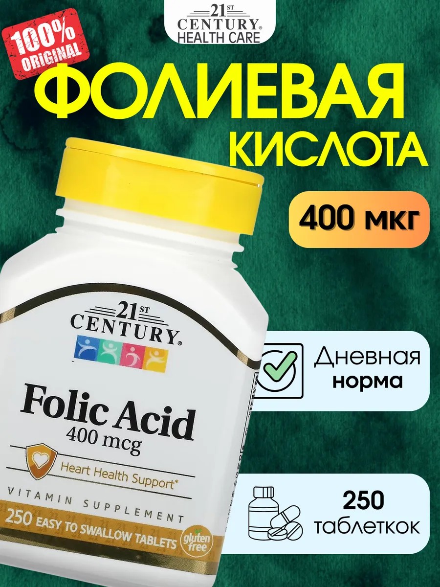 21st Century Фолиевая кислота, 400 мкг, 250 легко проглатываемых таблеток