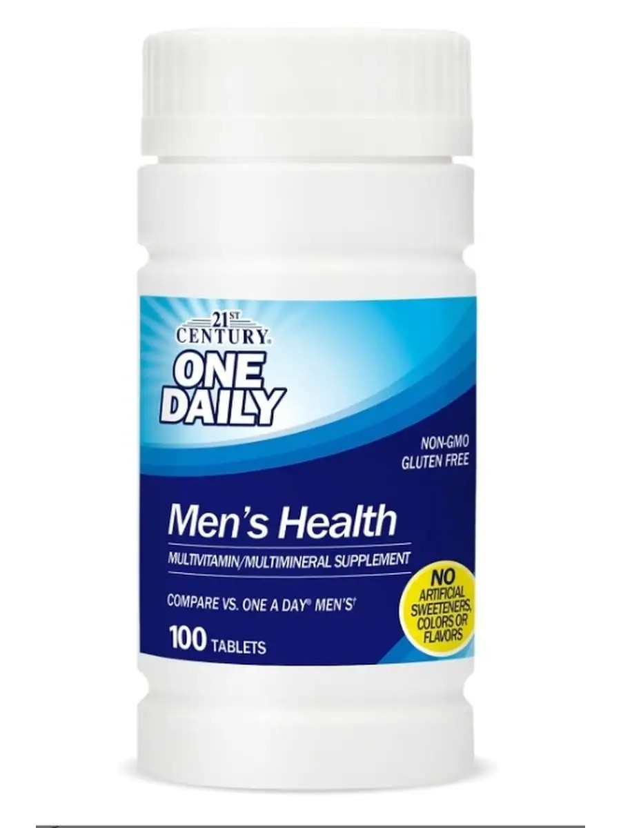 One Daily Men's Health from 21st Century is a multivitamin and mineral supplement for men. This complex is suitable for both preventative health support and overall well-being. Its rich composition positively impacts all bodily functions and systems. B vitamins, including biotin and folic acid, are essential for strengthening and maintaining healthy hair, skin, and nails. The mineral complex promotes strong bones and flexible joints. Vitamins D and ascorbic acid are also important for men's health, restoring immune function and supporting joint health. Alpha-tocopherol (E) is essential for healthy hematopoiesis; without it, there is a risk of erectile dysfunction. The balanced formula boosts immunity and energy production, promoting greater activity both during sports and during everyday life. Athletes will appreciate this supplement, which quickly restores strength after intense workouts. Directions: Adults take 1 tablet daily after meals or as directed by a healthcare professional. Do not exceed the recommended dosage. Individual results may vary. Serving Size: 1 Tablet Serving Size: 500g Vitamin A (as acetate and 14% as beta-carotene) - 3,500 IU Vitamin C (as ascorbic acid) - 60 mg Vitamin D3 (as cholecalciferol) - 700 IU Vitamin E (dl-alpha tocopheryl acetate) - 22.5 IU Vitamin K (as phytonadione) - 20 mcg Thiamine (as thiamine mononitrate) - 1.35 mg Riboflavin (vitamin B-2) - 1.7 mg Niacin (as nicotinamide) - 18 mg Vitamin B6 (as pyridoxine hydrochloride) - 3 mg Folic acid - 400 mcg Vitamin B12 (as cyanocobalamin) - 18 mcg Biotin (as d-biotin) - 75 mcg Pantothenic acid (as calcium d-pantothenate) - 16 mg Calcium (as calcium carbonate and dicalcium phosphate) - 213 mg Magnesium (as magnesium oxide) - 140 mg Zinc (as zinc oxide) - 15 mg Selenium (as sodium selenate) - 110 mcg Copper (as cupric oxide) - 2 mg Manganese (as manganese sulfate) - 2 mg Chromium (as chromium chloride) - 120 mcg Lycopene - 300 mcg Other ingredients: cellulose, stearic acid, starch, silicon dioxide. Contains <2% of the following ingredients: Ascorbyl Palmitate, BHA, BHT, Corn Oil, Croscarmellose Sodium, DL-Alpha Tocopherol, Gelatin, Acacia, Hydroxypropyl Methylcellulose, Magnesium Stearate, Maltodextrin, Mannitol, PEG, Polysorbate, Polyvinyl Alcohol, Sodium Ascorbate, Sucrose, Talc, Vegetable Oil, Water. No added yeast or artificial flavors. Warnings: If you are pregnant, nursing, taking any medications, or planning a medical procedure, consult your doctor before use. If any adverse reactions occur, stop use and consult your doctor. Precautions: Keep out of reach of children. In case of accidental overdose, call a doctor or Poison Control Center immediately. Do not use if packaging appears to be tampered with or seal is broken. Store at room temperature. Not a medicine.