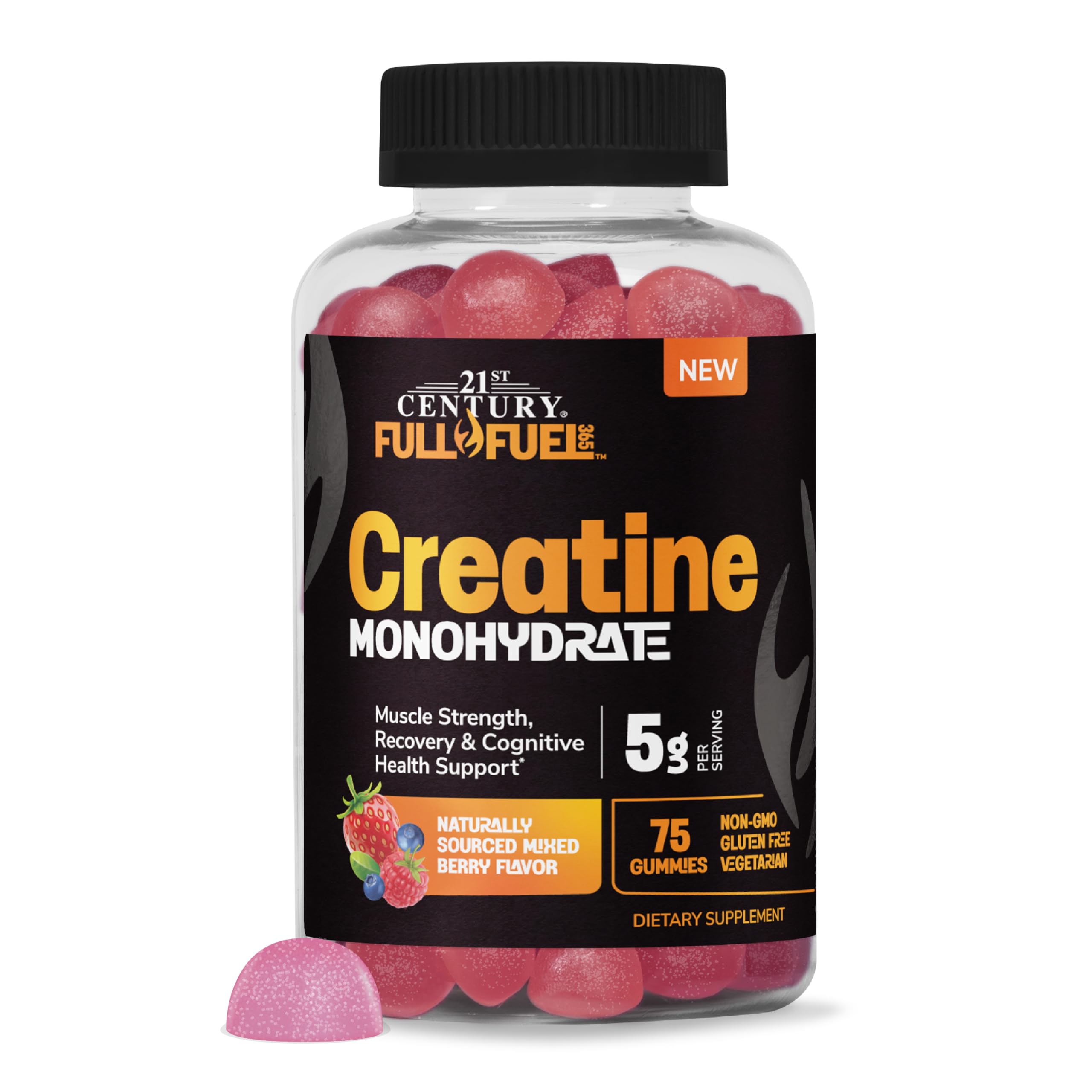 Full Fuel Creatine Support for Strength, Recovery Cognitive Health Fuel your performance with Full Fuel 365 Creatine Monohydrate Gummies, delivering 5 grams of creatine per serving to support muscle strength, recovery, and cognitive health. With a naturally sourced mixed berry flavor, these gummies offer a convenient and great-tasting way to include creatine in your daily wellness routine, no mixing or measuring required. Formulated to fit your lifestyle, these gummies are gluten-free, non-GMO, and vegetarian-friendly. Each batch is made with quality ingredients and no artificial flavors, milk, soy, or wheat. Whether you're an athlete, a fitness enthusiast, or just looking to stay active, Full Fuel 365 gummies are designed to support your goals - anytime, anywhere. Take five (5) gummies daily with at least 8 oz. of water or as directed by a healthcare provider. Individual results may vary. With over 30 years of expertise, 21st Century Vitamins maintains high standards to ensure each product supports your wellness needs. From sourcing premium ingredients to rigorous testing and production, every product meets purity benchmarks. These statements have not been evaluated by the Food and Drug Administration. These products are not intended to diagnose, treat, cure or prevent any disease.These statements have not been evaluated by the Food and Drug Administration. These products are not intended to diagnose, treat, cure or prevent any disease. WELLNESS THAT WORKS FOR YOU: For over 30 years, the 21st Century has been proud to offer high-quality, innovative, and trusted vitamin and supplement products to improve the health and well-being of individuals, families, and communities worldwide. DELICIOUS ON-THE-GO GUMMIES FOR CONVENIENCE: No powders or mixing required. Take 5 gummies with at least 8 oz. of water before, during, or after physical activity. For fitness enthusiasts, athletes, active adults and individuals with busy lifestyles . SUPPORTS MUSCLE STRENGTH COGNITIVE HEALTH : Formulated to support strength, recovery, and brain health function during high-intensity exercise. Our creatine supplement may help promote clarity and improve workout performance when used as directed . NATURALLY SOURCED MIXED BERRY FLAVOR: Tasty creatine monohydrate flavored gummies made with a naturally sourced mixed berry flavor. No artificial flavors. No milk, soy, or wheat. Non-GMO, gluten-free and vegetarian-friendly for your daily needs . PEAK PERFORMANCE AND OPTIMAL MUSCLE SUPPORT: 21st Century Full Fuel 365's 5-creatine gummy serving delivers 5g of creatine monohydrate to help support muscle strength, recovery, and cognitive health as part of your workout and wellness routine .