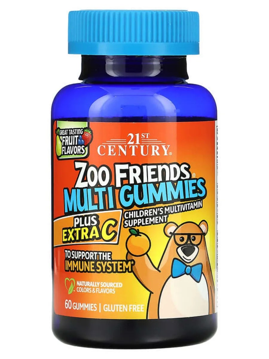 Мультивитамины с добавлением витамина C от 21st Century Zoo Friends - это жевательные мармеладки в форме медведя с натуральным фруктовым вкусом! Родители, вы можете быть уверены, что ваши дети получат ценную питательную поддержку с каждой ежедневной порцией жевательных таблеток Zoo Friends Multi Gummies Plus Extra C.