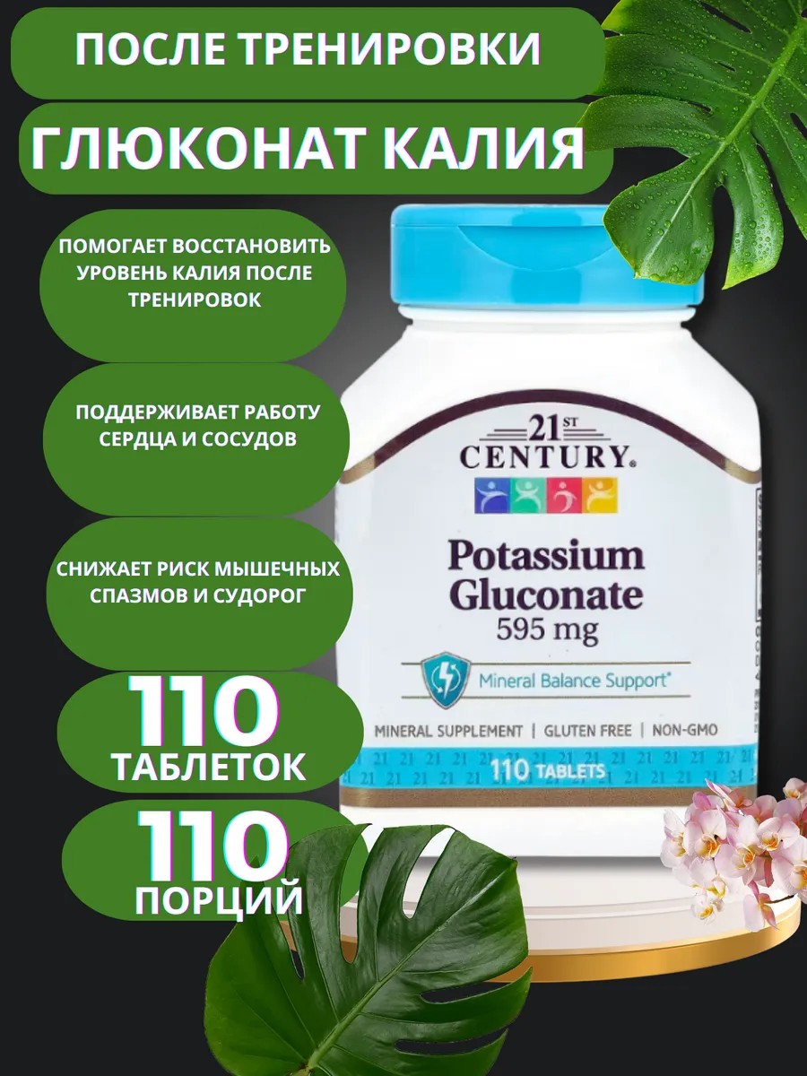 глюконат калия 595 мг от 21st century — источник калия для поддержания водно-электролитного баланса, работы сердечно-сосудистой системы и восстановления после физических нагрузок. участвует в передаче нервных импульсов и поддержании мышечного тонуса.
